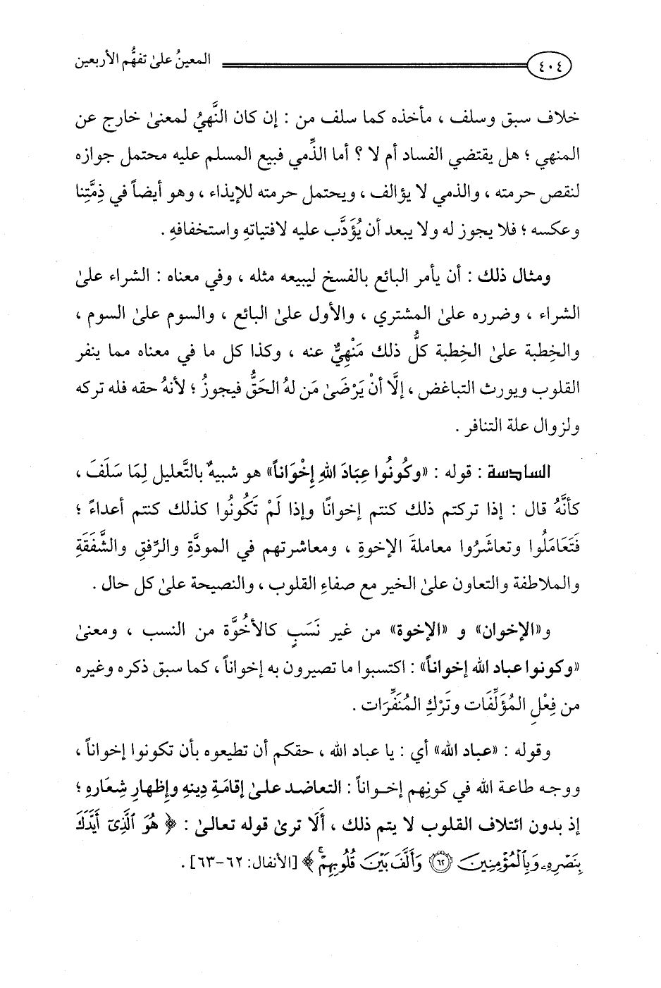 و"الإخوان" و "الإخوة" من غير نَسَبٍ كالأخُوَّة من النسب، ومعنى "وكونوا عباد الله إخوانًا": اكتسبوا ما تصيرون به إخوانًا، كما سبق ذكره وغيره من فِعلِ المُؤَلِّفَات وتركِ المُنفِّرَات.