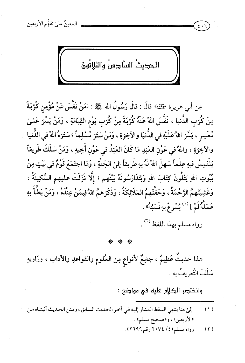 عن أبي هريرة - رضي الله عنه - قالَ: قالَ رَسُولُ الله - صلى الله عليه وسلم -: "مَنْ نَفَّسَ عَنْ مُؤْمنٍ كربَةً مِنْ كُرَبِ الدُّنيا، نَفَّسَ اللهُ عَنْهُ كربَةً مِنْ كُرَبِ يَوْمِ القِيَامَةِ، وَمَنْ يَسَّرَ عَلى مُعسِرٍ، يَسَّرَ الله عَلَيْهِ في الدُّنيَا والآخِرَةِ، وَمَنْ ستَرَ مُسْلِمًا؛ ستَرةُ اللهُ في الدُّنيا والآخِرَةِ، واللهُ في عَوْنِ العَبْدِ مَا كَانَ العبدُ في عَوْنِ أَخِيهِ، وَمَنْ سَلَكَ طَريقًا يَلْتَمِسُ فيهِ عِلْمًا سَهلَ اللهُ لَهُ بهِ طَريقًا إلى الجَنةِ، وَمَا اجتَمَعَ قَوْمٌ في بَيْتٍ مِنْ بُيوتِ اللهِ يَتْلُونَ كِتَابَ اللهِ وَيَتَدَارَسُونَهُ بَيْنَهم؛ إلا نَزَلَتْ عليهم السَّكِينَةُ، وَغَشِيَتْهمُ الرَّخمَةُ، وَحَفَتْهمُ المَلَائِكَةُ، وَذَكَرَهمُ اللهُ فِيمَنْ عِنْدهُ، وَمَنْ بَطَّأَ بهِ عَمَلُهُ لَم] (¬1) يُسْرع بهِ نَسَبُهُ".