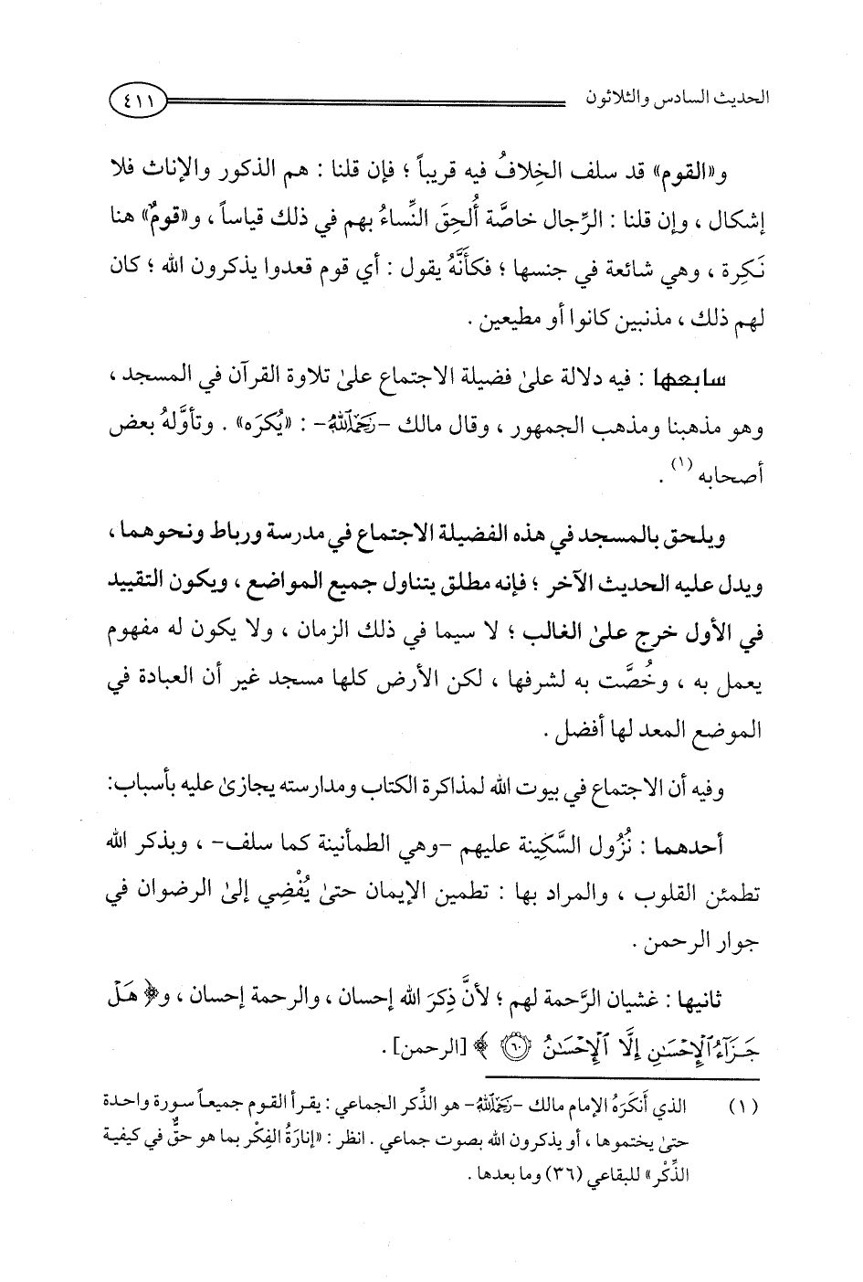 (¬1) الذي أَنكَرَهُ الإمام مالك -رحمه الله- هو الذكر الجماعي: يقرأ القوم جميعًا سورة واحدة حتى يختموها، أو يذكرون الله بصوت جماعي. انظر: "إنارَةُ الفِكر بما هو حق في كيفية الذِّكْر" للبقاعي (36) وما بعدها.