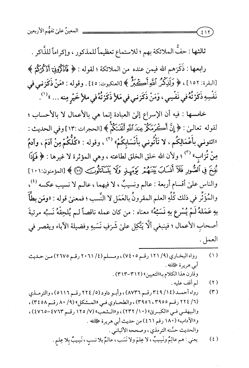 خامسها: فيه أن الإسراع إلى العبادة إنما هي بالأعمال لا بالأحساب؛ لقوله تعالى: {إِنَّ أَكْرَمَكُمْ عِنْدَ اللَّهِ أَتْقَاكُمْ} [الحجرات: 13] وفي الحديث: "ائتوني بأَعمَالِكُم، لا تَأْتُوني بأَنْسَابِكُم" (¬2)، وقوله: "كلُّكُم مِنْ آدَمَ، وآدمُ مِنْ تُرَاب" (¬3)؛ ولأن الله خلق الخلق لطاعته، وهي المؤثرة لا غيرها: {فَإِذَا نُفِخَ فِي الصُّورِ فَلَا أَنْسَابَ بَيْنَهُمْ يَوْمَئِذٍ وَلَا يَتَسَاءَلُونَ (101)} [المؤمنون: 101] والناس على أقسام أربعة: عالم ونسيبٌ، لا فيهما، عالم لا نسيب عكسه (¬4)، والمؤَثِّر في ذلك كلِّهِ العلم المقرونُ بالعَمَل لا النَّسب؛ فمعنى قوله: "ومَن بطَّأَ بهِ عَمَلهُ لَمْ يُسْرع بهِ نَسَبُهُ" معناه: من كان عمله ناقصًا لم يُلحِقهُ نَسبُه مرتبةَ أصحابِ الأعمال؛ فينبغي ألا يَتَّكِل على شَرَفِ نَسَبهِ وفضيلة الآباء ويقصر في العمل.