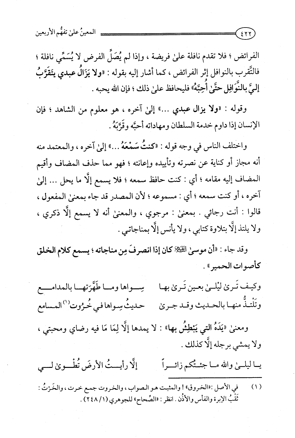 واختلف الناس في وجه قوله: "كنتُ سمعَهُ ... " إلى آخره، والمعتمد منه أنه مجاز أو كناية عن نصرته وتأييده وإعانته؛ فهو مما حذف المضاف وأقيم المضاف إليه مقامه؛ أي: كنت حافظ سمعه؛ فلا يسمع إلا ما يحل ... إلى آخره، أو كنت سمعه؛ أي: مسموعه؛ لأن المصدر قد جاء بمعنى المفعول، قالوا: أنت رجائي. بمعنى: مرجوي، والمعنى أنه لا يسمع إلَّا ذكري، ولا يلتذ إلَّا بتلاوة كتابي، ولا يأنس إلَّا بمناجاتي.