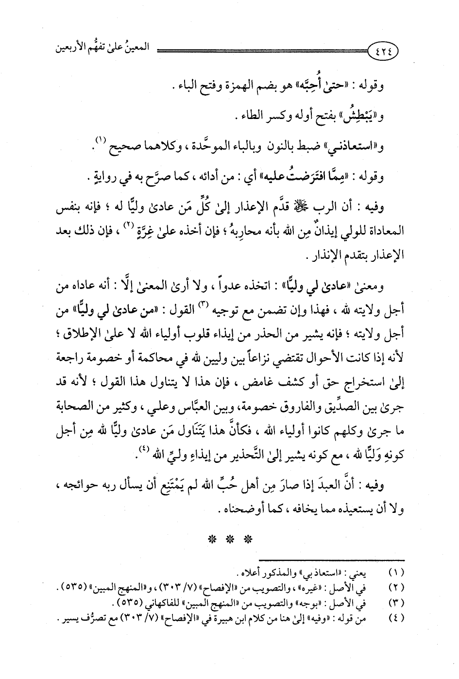 ومعنى "عادى لي وليا": اتخذه عدوًا، ولا أرى المعنى إلَّا: أنه عاداه من أجل ولايته لله، فهذا وإن تضمن مع توجيه (¬3) القول: "من عادى لي وليًّا" من أجل ولايته، فإنه يشير من الحذر من إيذاء قلوب أولياء الله لا على الإطلاق؛ لأنه إذا كانت الأحوال تقتضي نزاعًا بين وليين لله في محاكمة أو خصومة راجعة إلى استخراج حق أو كشف غامض، فإن هذا لا يتناول هذا القول؛ لأنه قد جرى بين الصدِّيق والفاروق خصومه، وبين العبَّاس وعلي، وكثير من الصحابة ما جرى وكلهم كانوا أولياء الله، فكأنَّ هذا يَتَنَاول مَن عادى وليًّا لله مِن أجل كونهِ وَليًّا لله، مع كونه يشير إلى التَّحذير من إيذاءِ وليِّ الله (¬4).
