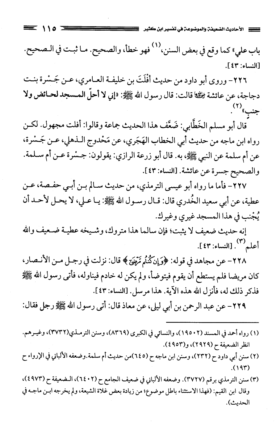227 - فأما ما رواه أبو عيسى الترمذي، من حديث سالم بن أبي حفصة، عن عطية، عن أبي سعيد الخُدري قال: قال رسول الله صَلَّى اللَّهُ عَلَيْهِ وَسَلَّمَ: يا علي، لا يحل لأحد أن يُجْنب في هذا المسجد غيري وغيرك.