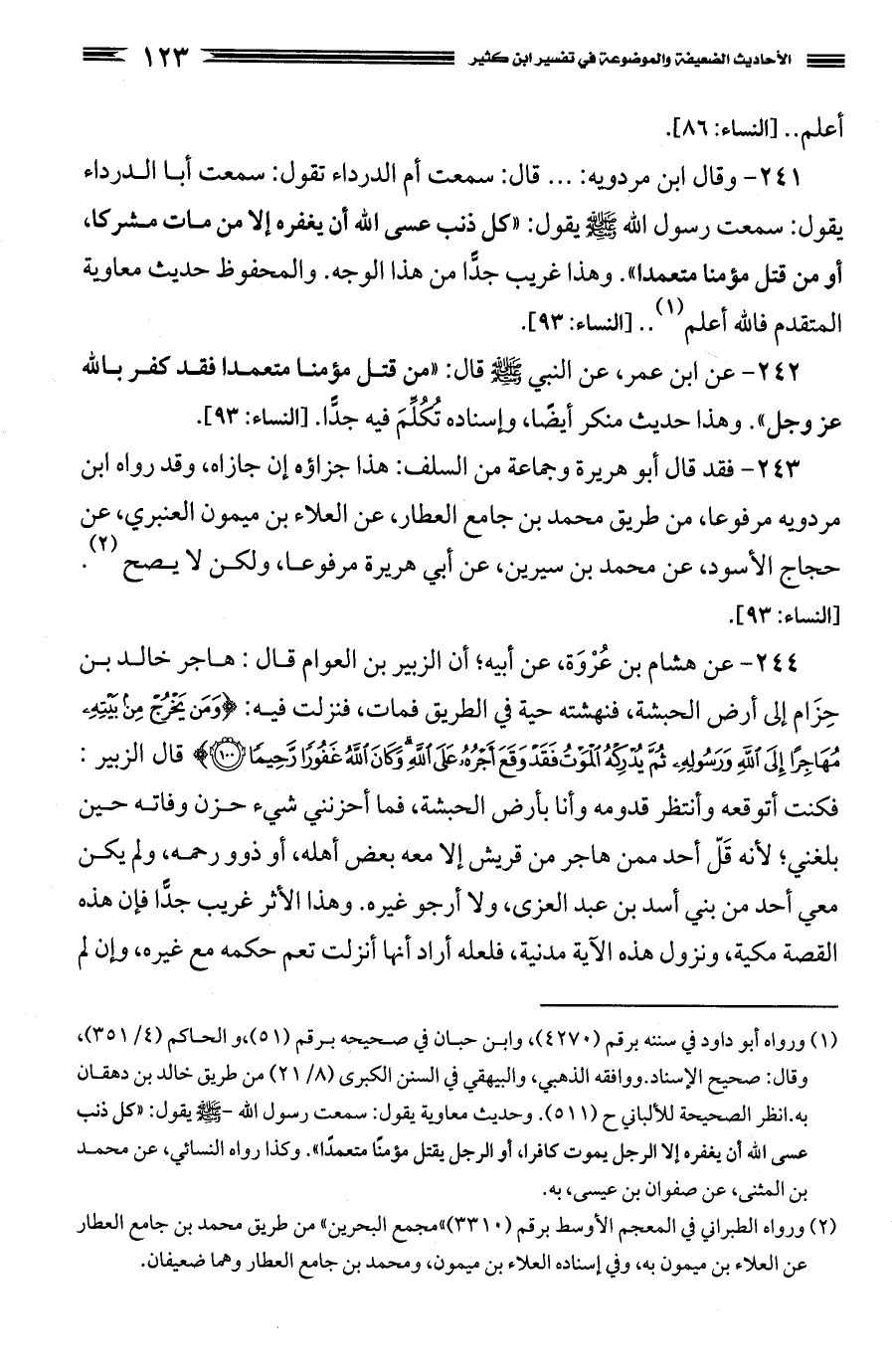 242 - عن ابن عمر، عن النبي صَلَّى اللَّهُ عَلَيْهِ وَسَلَّمَ قال: "من قتل مؤمنا متعمدا فقد كفر بالله عز وجل". وهذا حديث منكر أيضا، وإسناده تُكُلم فيه جدا. (النساء: 93)