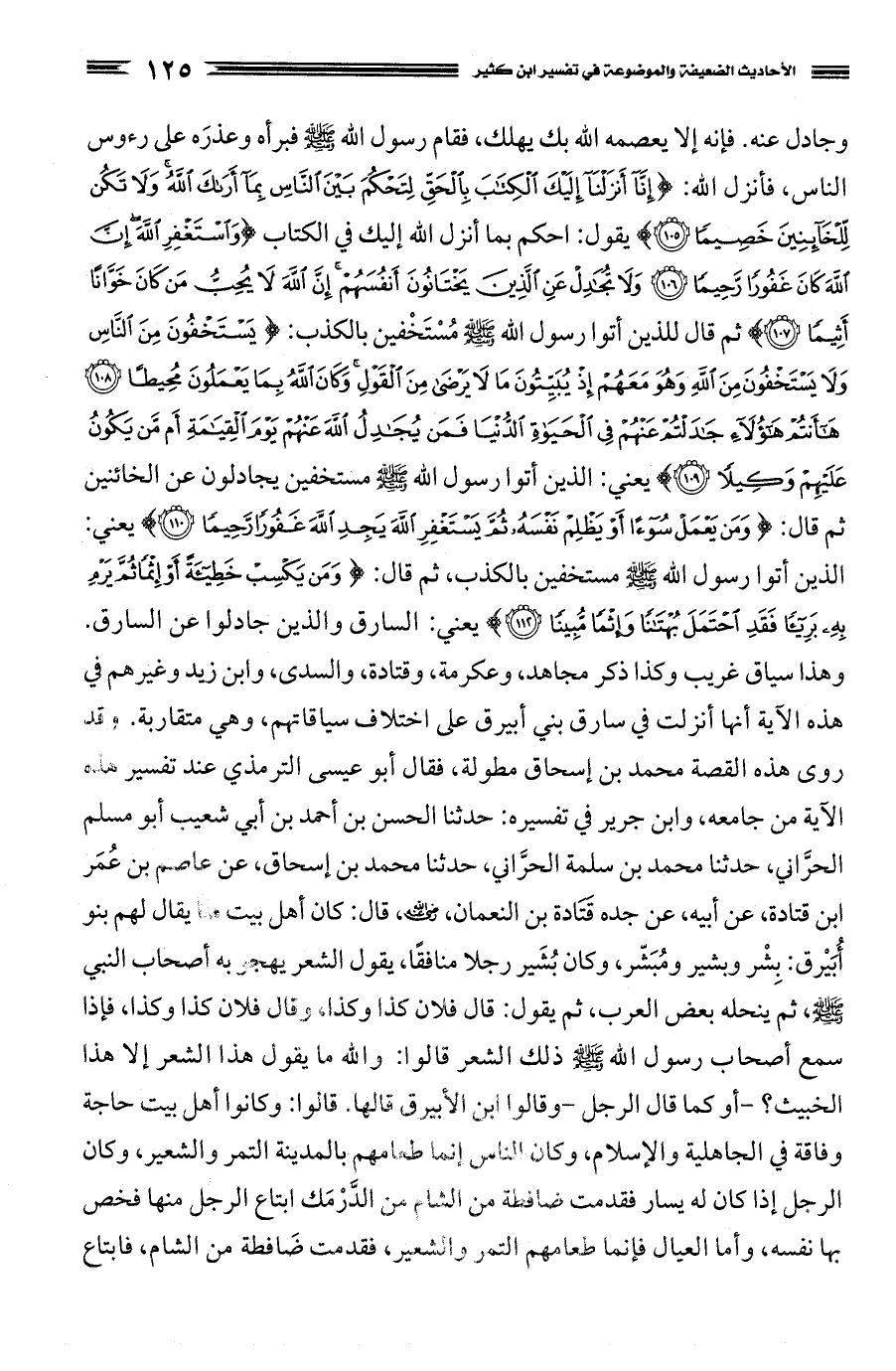 وجادل عنه. فإنه إلا يعصمه الله بك يهلك، فقام رسول الله صَلَّى اللَّهُ عَلَيْهِ وَسَلَّمَ فبرأه وعذرَه على رءوس الناس، فأنزل الله: {إِنَّا أَنزلْنَا إِلَيْكَ الْكِتَابَ بِالْحَقِّ لِتَحْكُمَ بَيْنَ النَّاسِ بِمَا أَرَاكَ اللَّهُ وَلا تَكُنْ لِلْخَائِنِينَ خَصِيمًا} [يقول: احكم بما أنزل الله إليك في الكتاب] {وَاسْتَغْفِرِ اللَّهَ إِنَّ اللَّهَ كَانَ غَفُورًا رَحِيمًا. وَلا تُجَادِلْ عَنِ الَّذِينَ يَخْتَانُونَ أَنْفُسَهُمْ [إِنَّ اللَّهَ لا يُحِبُّ مَنْ كَانَ خَوَّانًا أَثِيمًا]} ثم قال للذين أتوا رسول الله صَلَّى اللَّهُ عَلَيْهِ وَسَلَّمَ مُسْتَخْفين بالكذب: {يَسْتَخْفُونَ مِنَ النَّاسِ وَلا يَسْتَخْفُونَ مِنَ اللَّهِ [وَهُوَ مَعَهُمْ إِذْ يُبَيِّتُونَ مَا لا يَرْضَى مِنَ الْقَوْلِ وَكَانَ اللَّهُ بِمَا يَعْمَلُونَ مُحِيطًا.