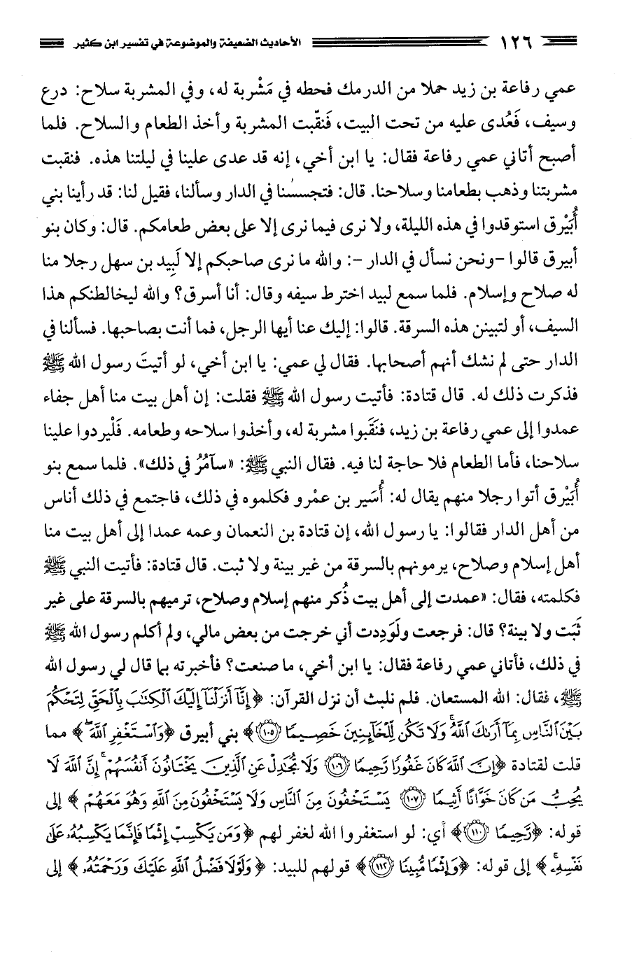 قال: فرجعت ولَوَدِدت أني خرجت من بعض مالي، ولم أكلم رسول الله صَلَّى اللَّهُ عَلَيْهِ وَسَلَّمَ في ذلك، فأتاني عمي رفاعة فقال: يا ابن أخي، ما صنعت؟ فأخبرته بما قال لي رسول الله صَلَّى اللَّهُ عَلَيْهِ وَسَلَّمَ، فقال: الله المستعان. فلم نلبث أن نزل القرآن: {إِنَّا أَنزلْنَا إِلَيْكَ الْكِتَابَ بِالْحَقِّ لِتَحْكُمَ بَيْنَ النَّاسِ بِمَا أَرَاكَ اللَّهُ وَلا تَكُنْ لِلْخَائِنِينَ خَصِيمًا} بني أبيرق {وَاسْتَغْفِرِ اللَّهَ} مما قلت لقتادة {إِنَّ اللَّهَ كَانَ غَفُورًا رَحِيمًا. وَلا تُجَادِلْ عَنِ الَّذِينَ يَخْتَانُونَ أَنْفُسَهُمْ [إِنَّ اللَّهَ لا يُحِبُّ مَنْ كَانَ خَوَّانًا أَثِيمًا. يَسْتَخْفُونَ مِنَ النَّاسِ وَلا يَسْتَخْفُونَ مِنَ اللَّهِ وَهُوَ مَعَهُمْ] (8)} إلى قوله: {رَحِيمًا} أي: لو استغفروا الله لغفر لهم {وَمَنْ يَكْسِبْ إِثْمًا فَإِنَّمَا يَكْسِبُهُ عَلَى نَفْسِهِ} إلى قوله: {إِثْمًا مُبِينًا} قولهم للبيد: {وَلَوْلا فَضْلُ اللهِ عَلَيْكَ وَرَحْمَتُهُ} إلى