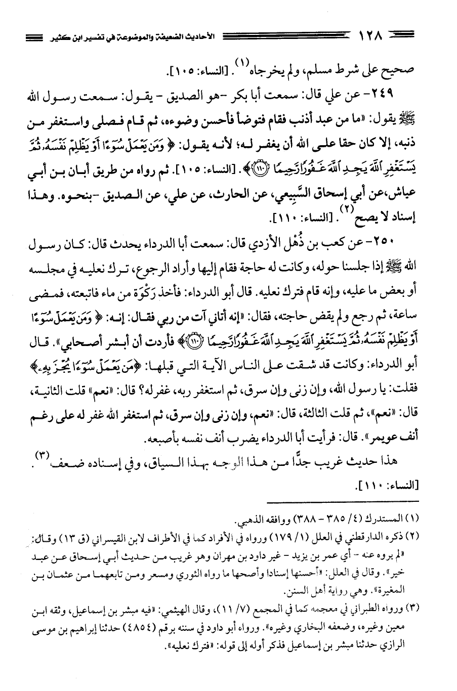 249 - عن علي قال: سمعت أبا بكر - هو الصديق - يقول: سمعت رسول الله صَلَّى اللَّهُ عَلَيْهِ وَسَلَّمَ يقول: "ما من عبد أذنب فقام فتوضأ فأحسن وضوءه، ثم قام فصلى واستغفر من ذنبه، إلا كان حقا على الله أن يغفر له؛ لأنه يقول: {وَمَنْ يَعْمَلْ سُوءًا أَوْ يَظْلِمْ نَفْسَهُ [ثُمَّ يَسْتَغْفِرِ اللَّهَ يَجِدِ اللَّهَ غَفُورًا رَحِيمًا]}. (النساء: 105) ثم رواه من طريق أبان بن أبي عياش، عن أبي إسحاق السَّبِيعي، عن الحارث، عن علي، عن الصديق - بنحوه. وهذا إسناد لا يصح (¬2). (النساء: 110)