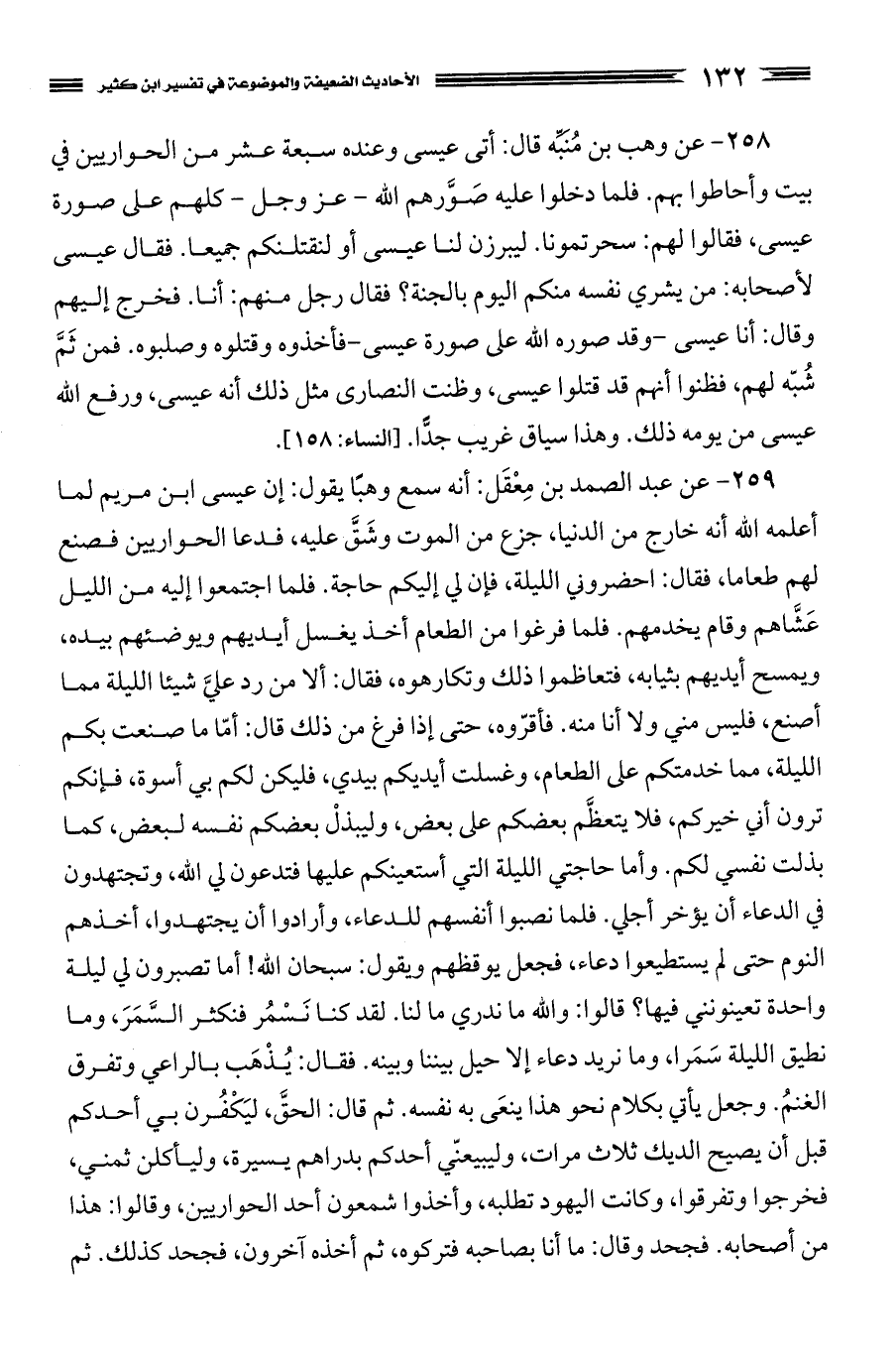 258 - عن وهب بن مُنَبِّه قال: أتى عيسى وعنده سبعة عشر من الحواريين في بيت وأحاطوا بهم. فلما دخلوا عليه صَوَّرهم الله، عز وجل، كلهم على صورة عيسى، فقالوا لهم: سحرتمونا. ليبرزن لنا عيسى أو لنقتلنكم جميعا. فقال عيسى لأصحابه: من يشري نفسه منكم اليوم بالجنة؟ فقال رجل منهم: أنا. فخرج إليهم وقال: أنا عيسى - وقد صوره الله على صورة عيسى - فأخذوه وقتلوه وصلبوه. فمن ثَمَّ شُبّه لهم، فظنوا أنهم قد قتلوا عيسى، وظنت النصارى مثل ذلك أنه عيسى، ورفع الله عيسى من يومه ذلك. وهذا سياق غريب جدًّا. (النساء: 158)