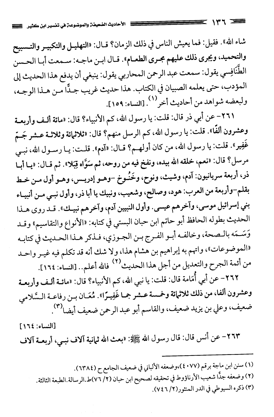 262 - عن أبي أُمَامة قال: قلت: يا نبي الله، كم الأنبياء؟ قال: "مائة ألف وأربعة وعشرون ألفا، من ذلك ثلاثمائة وخمسة عشر جما غَفِيرًا". مُعَان بن رفاعة السَّلامي ضعيف، وعلي بن يزيد ضعيف، والقاسم أبو عبد الرحمن ضعيف أيضا (¬3). (النساء: 164)