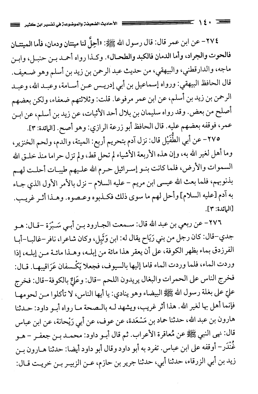 قلت: وثلاثتهم ضعفاء، ولكن بعضهم أصلح من بعض. وقد رواه سليمان بن بلال أحد الأثبات، عن زيد بن أسلم، عن ابن عمر، فوقفه بعضهم عليه. قال الحافظ أبو زرعة الرازي: وهو أصح. (المائدة: 3)