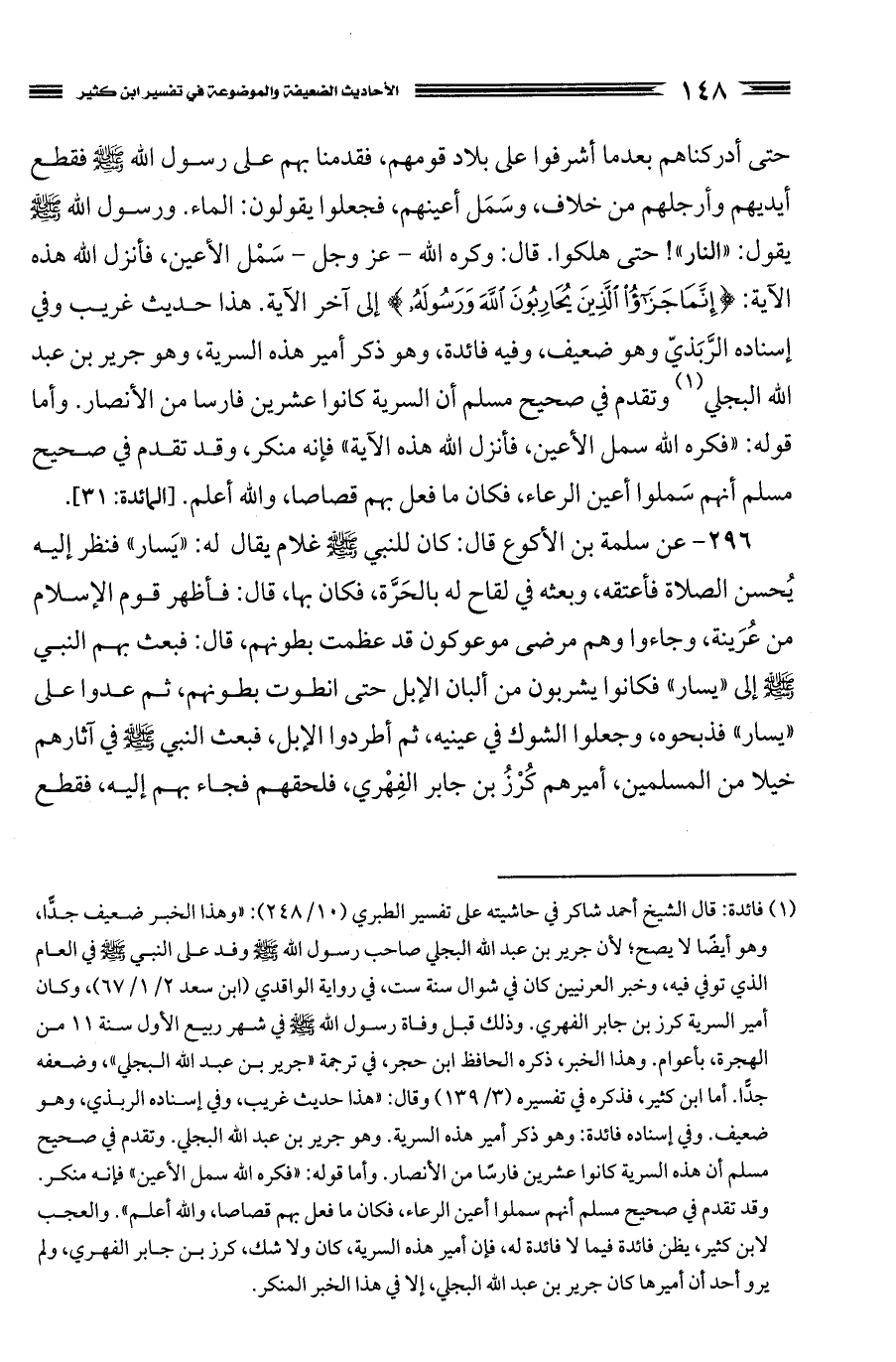 (¬1) فائدة: قال الشيخ أحمد شاكر في حاشيته على تفسير الطبري (10/ 248): "وهذا الخبر ضعيف جدًا، وهو أيضًا لا يصح؛ لأن جرير بن عبد الله البجلي صاحب رسول الله صَلَّى اللَّهُ عَلَيْهِ وَسَلَّمَ وفد على النبي صَلَّى اللَّهُ عَلَيْهِ وَسَلَّمَ في العام الذي توفي فيه، وخبر العرنيين كان في شوال سنة ست، في رواية الواقدي (ابن سعد 2/ 1/67)، وكان أمير السرية كرز بن جابر الفهري. وذلك قبل وفاة رسول الله صَلَّى اللَّهُ عَلَيْهِ وَسَلَّمَ في شهر ربيع الأول سنة 11 من الهجرة، بأعوام.