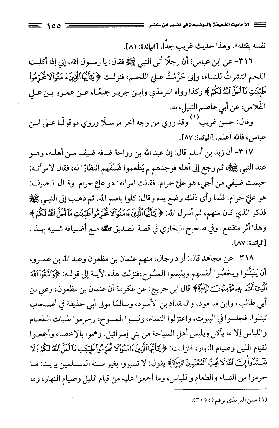 318 - عن مجاهد قال: أراد رجال، منهم عثمان بن مظعون وعبد الله بن عمرو، أن يَتَبَتَّلوا ويخصُوا أنفسهم ويلبسوا المسُوح، فنزلت هذه الآية إلى قوله: {وَاتَّقُوا اللَّهَ الَّذِي أَنْتُمْ بِهِ مُؤْمِنُونَ} قال ابن جريج: عن عكرمة أن عثمان بن مظعون، وعلي بن أبي طالب، وابن مسعود، والمقداد بن الأسود، وسالمًا مولى أبي حذيفة في أصحاب تبتلوا، فجلسوا في البيوت، واعتزلوا النساء، ولبسوا المسوح، وحرموا طيبات الطعام واللباس إلا ما يأكل ويلبس أهل السياحة من بني إسرائيل، وهموا بالإخصاء وأجمعوا لقيام الليل وصيام النهار، فنزلت: {يَا أَيُّهَا الَّذِينَ آمَنُوا لا تُحَرِّمُوا طَيِّبَاتِ مَا أَحَلَّ اللَّهُ لَكُمْ وَلا تَعْتَدُوا إِنَّ اللَّهَ لا يُحِبُّ الْمُعْتَدِينَ} يقول: لا تسيروا بغير سنة المسلمين يريد: ما حرموا من النساء والطعام واللباس، وما أجمعوا عليه من قيام الليل وصيام النهار، وما
