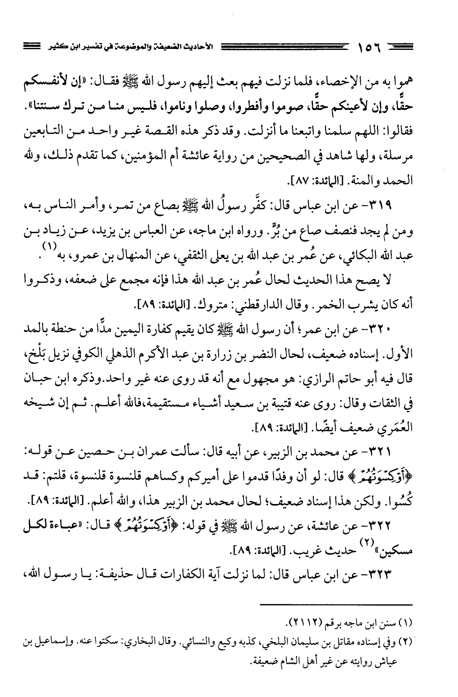 319 - عن ابن عباس قال: كفَّر رسولُ الله صَلَّى اللَّهُ عَلَيْهِ وَسَلَّمَ بصاع من تمر، وأمر الناس به، ومن لم يجد فنصف صاع من بُرٍّ.