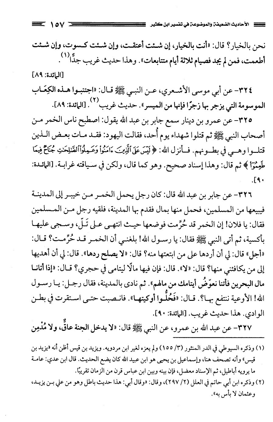 325 - عن عمرو بن دينار سمع جابر بن عبد الله يقول: اصطبح ناس الخمر من أصحاب النبي صَلَّى اللَّهُ عَلَيْهِ وَسَلَّمَ ثم قتلوا شهداء يوم أحد، فقالت اليهود: فقد مات بعض الذين قتلوا وهي في بطونهم. فأنزل الله: {لَيْسَ عَلَى الَّذِينَ آمَنُوا وَعَمِلُوا الصَّالِحَاتِ جُنَاحٌ فِيمَا طَعِمُوا} ثم قال: وهذا إسناد صحيح. وهو كما قال، ولكن في سياقته غرابة. (المائدة: 90)