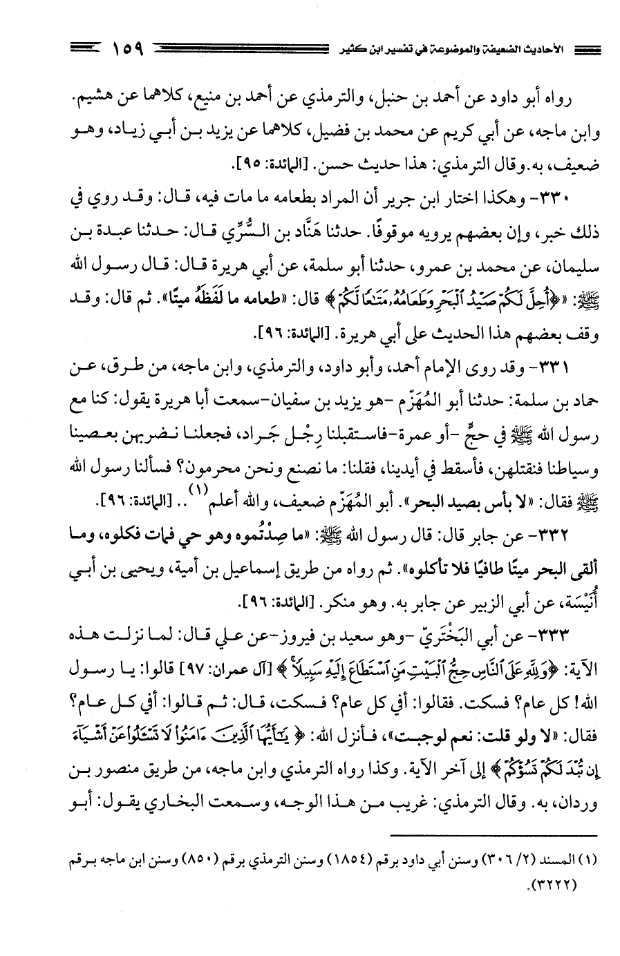 331 - وقد روى الإمام أحمد، وأبو داود، والترمذي، وابن ماجه، من طرق، عن حماد بن سلمة: حدثنا أبو المُهَزّم - هو يزيد بن سفيان - سمعت أبا هريرة يقول: كنا مع رسول الله صَلَّى اللَّهُ عَلَيْهِ وَسَلَّمَ في حج - أو عمرة - فاستقبلنا رِجْل جَراد، فجعلنا نضربهن بعصينا وسياطنا فنقتلهن، فأسقط في أيدينا، فقلنا: ما نصنع ونحن محرمون؟ فسألنا رسول الله صَلَّى اللَّهُ عَلَيْهِ وَسَلَّمَ فقال: "لا بأس بصيد البحر" أبو المُهَزّم ضعيف، والله أعلم. (¬1). (المائدة: 96)