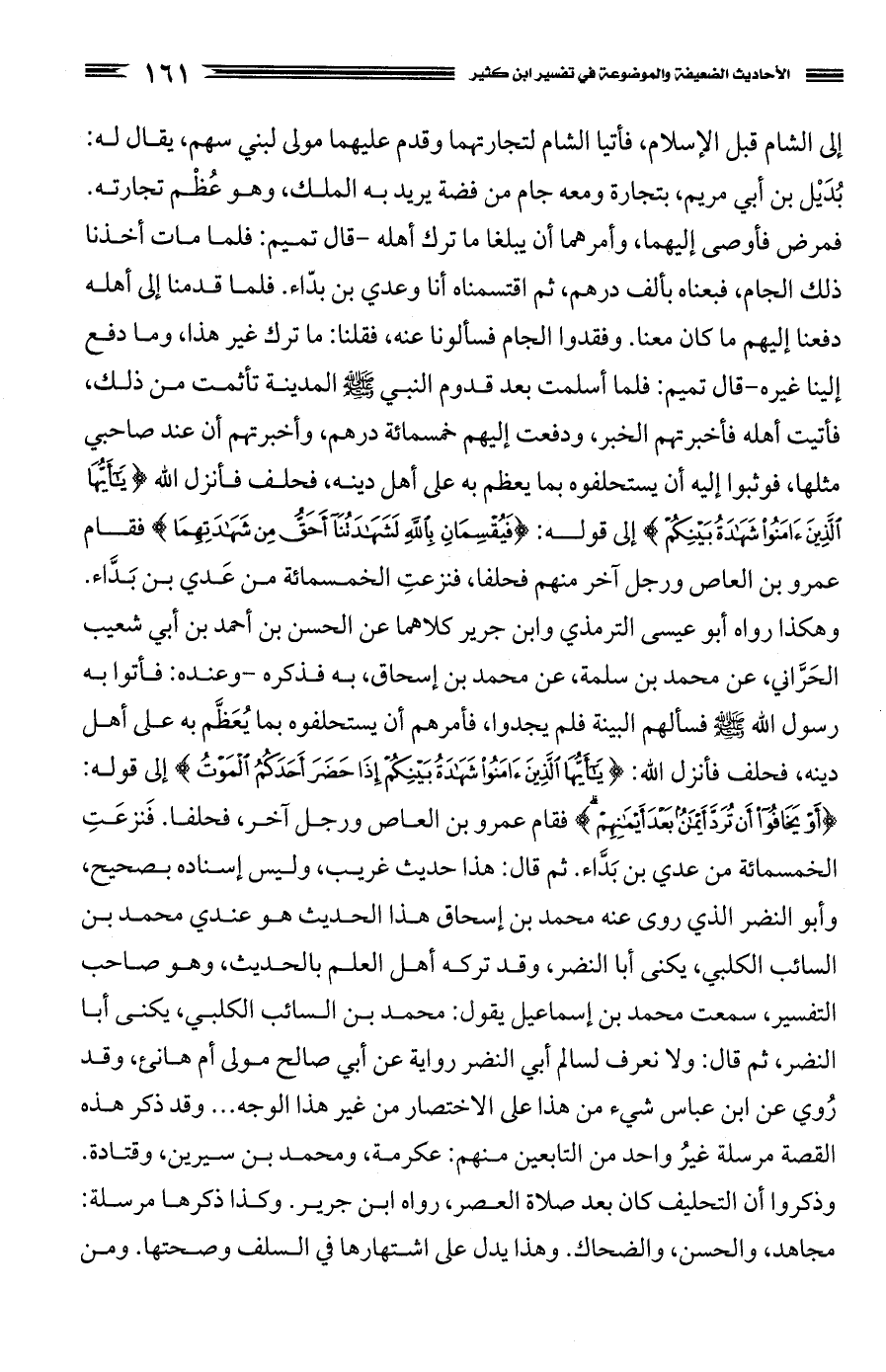 ثم قال: هذا حديث غريب، وليس إسناده بصحيح، وأبو النضر الذي روى عنه محمد بن إسحاق هذا الحديث هو عندي محمد بن السائب الكلبي، يكنى أبا النضر، وقد تركه أهل العلم بالحديث، وهو صاحب التفسير، سمعت محمد بن إسماعيل يقول: محمد بن السائب الكلبي، يكنى أبا النضر، ثم قال: ولا نعرف لسالم أبي النضر رواية عن أبي صالح مولى أم هانئ، وقد رُوي عن ابن عباس شيء من هذا على الاختصار من غير هذا الوجه ... وقد ذكر هذه القصة مرسلة غيرُ واحد من التابعين منهم: عكرمة، ومحمد بن سيرين، وقتادة. وذكروا أن التحليف كان بعد صلاة العصر، رواه ابن جرير. وكذا ذكرها مرسلة: مجاهد، والحسن، والضحاك. وهذا يدل على اشتهارها في السلف وصحتها.