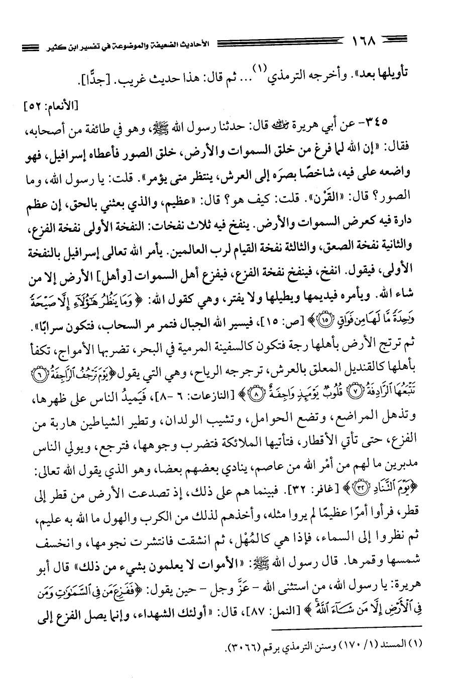 345 - عن أبي هريرة، رضي الله عنه قال: حدثنا رسول الله صَلَّى اللَّهُ عَلَيْهِ وَسَلَّمَ، وهو في طائفة من أصحابه، فقال: "إن الله لما فرغ من خلق السموات والأرض، خلق الصور فأعطاه إسرافيل، فهو واضعه على فيه، شاخصًا بصرَه إلى العرش، ينتظر متى يؤمر". قلت: يا رسول الله، وما الصور؟ قال "القَرْن". قلت: كيف هو؟ قال: "عظيم، والذي بعثني بالحق، إن عظم دارة فيه كعرض السموات والأرض. ينفخ فيه ثلاث نفخات: النفخة الأولى نفخة الفزع، والثانية نفخة الصعق، والثالثة نفخة القيام لرب العالمين. يأمر الله تعالى إسرافيل بالنفخة الأولى، فيقول. انفخ، فينفخ نفخة الفزع، فيفزع أهل السموات [وأهل] الأرض إلا من شاء الله. ويأمره فيديمها ويطيلها ولا يفتر، وهي كقول الله: {وَمَا يَنْظُرُ هَؤُلاءِ إِلا صَيْحَةً وَاحِدَةً مَا لَهَا مِنْ فَوَاقٍ} [ص: 15]، فيسير الله الجبال فتمر مر السحاب، فتكون سرابًا".