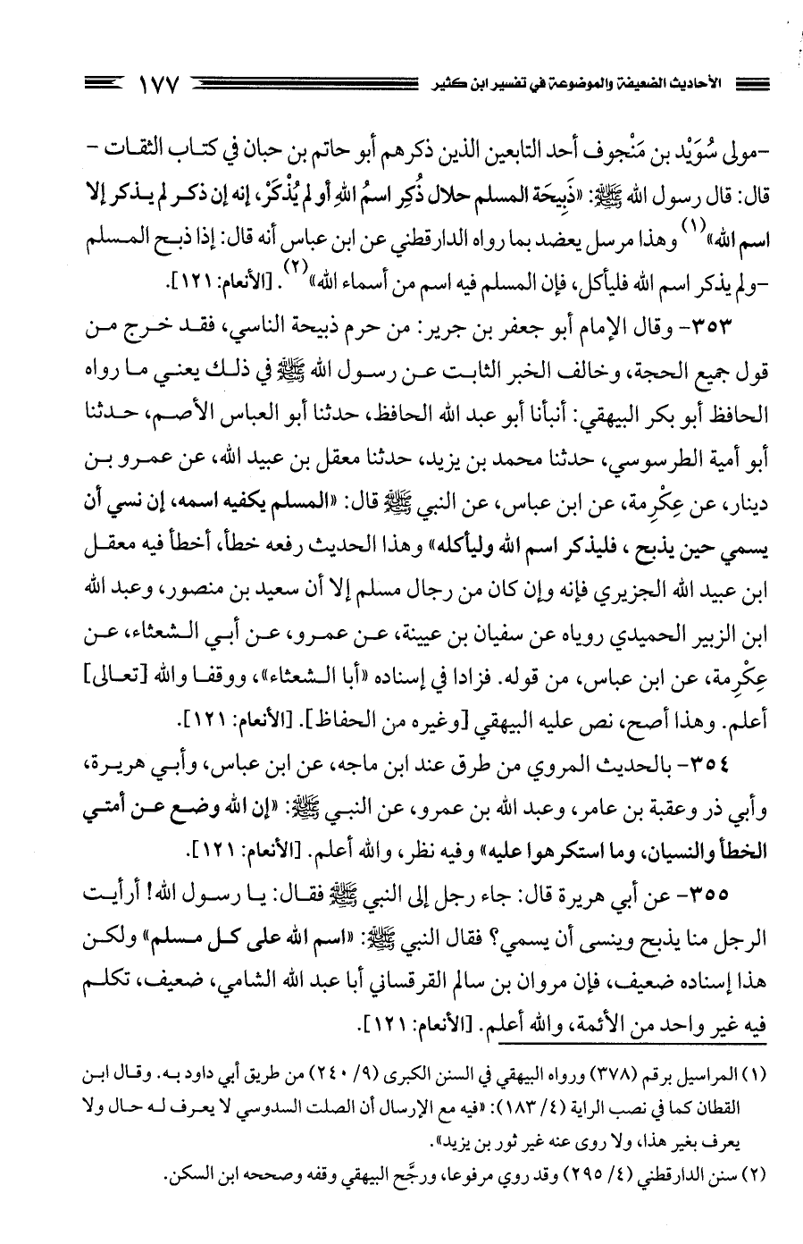 355 - عن أبي هريرة قال: جاء رجل إلى النبي صَلَّى اللَّهُ عَلَيْهِ وَسَلَّمَ فقال: يا رسول الله، أرأيت الرجل منا يذبح وينسى أن يسمي؟ فقال النبي صَلَّى اللَّهُ عَلَيْهِ وَسَلَّمَ: "اسم الله على كل مسلم" ولكن هذا إسناده ضعيف، فإن مروان بن سالم القرقساني أبا عبد الله الشامي، ضعيف، تكلم فيه غير واحد من الأئمة، والله أعلم. (الأنعام: 121)