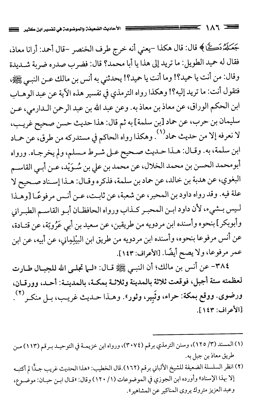 384 - عن أنس بن مالك؛ أن النبي صَلَّى اللَّهُ عَلَيْهِ وَسَلَّمَ قال: "لما تجلى الله للجبال طارت لعظمته ستة أجبل، فوقعت ثلاثة بالمدينة وثلاثة بمكة، بالمدينة: أحد، وورقان، ورضوى. ووقع بمكة: حراء، وثَبِير، وثور". وهذا حديث غريب، بل منكر. (¬2) (الأعراف: 143)