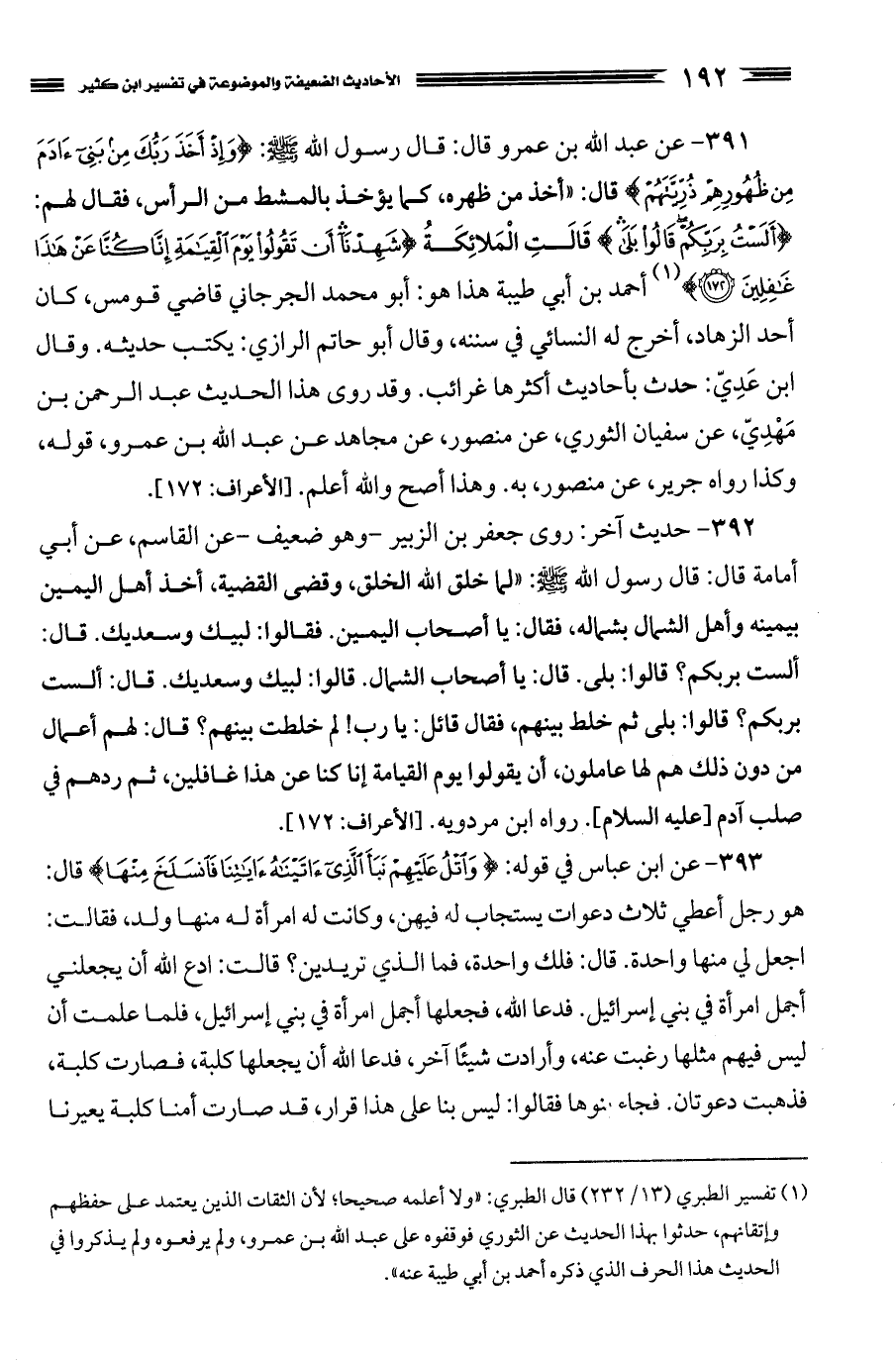 391 - عن عبد الله بن عمرو قال: قال رسول الله صَلَّى اللَّهُ عَلَيْهِ وَسَلَّمَ {وَإِذْ أَخَذَ رَبُّكَ مِنْ بَنِي آدَمَ مِنْ ظُهُورِهِمْ ذُرِّيَّتَهُمْ} قال: "أخذ من ظهره، كما يؤخذ بالمشط من الرأس، فقال لهم: {ألست بربكم قالوا بلى} قَالَتِ الْمَلائِكَةُ {شهدنا أن يقولوا} يوم القيامة إنا كنا عن هذا غافلين (¬1)