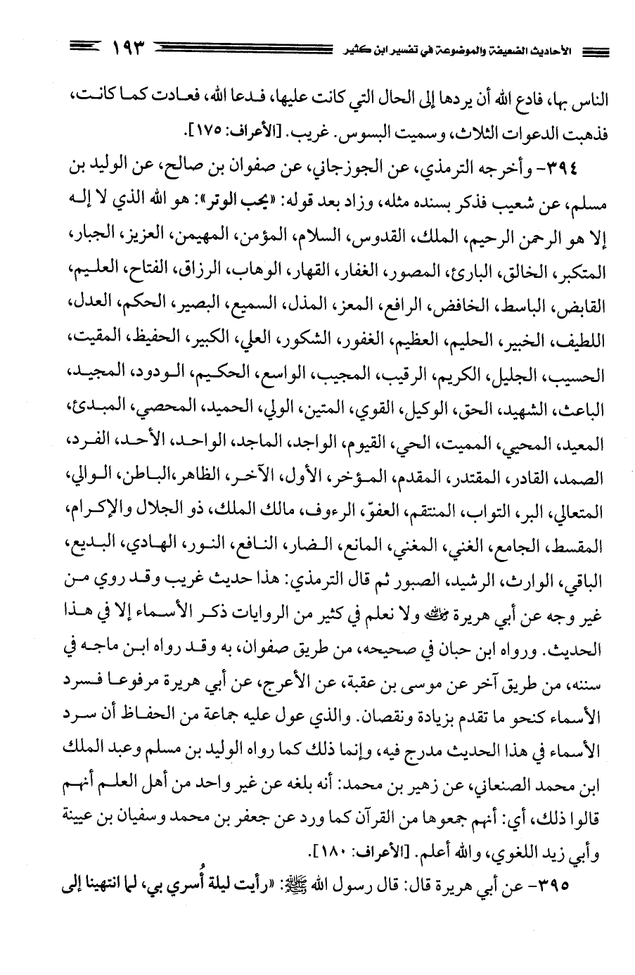 394 - وأخرجه الترمذي، عن الجوزجاني، عن صفوان بن صالح، عن الوليد بن مسلم، عن شعيب فذكر بسنده مثله، وزاد بعد قوله: "يحب الوتر": هو الله الذي لا إله إلا هو الرحمن الرحيم، الملك، القدوس، السلام، المؤمن، المهيمن، العزيز، الجبار، المتكبر، الخالق، البارئ، المصور، الغفار، القهار، الوهاب، الرزاق، الفتاح، العليم، القابض، الباسط، الخافض، الرافع، المعز، المذل، السميع، البصير، الحكم، العدل، اللطيف، الخبير، الحليم، العظيم، الغفور، الشكور، العلي، الكبير، الحفيظ، المقيت، الحسيب، الجليل، الكريم، الرقيب، المجيب، الواسع، الحكيم، الودود، المجيد، الباعث، الشهيد، الحق، الوكيل، القوي، المتين، الولي، الحميد، المحصي، المبدئ، المعيد، المحيي، المميت، الحي، القيوم، الواجد، الماجد، الواحد، الأحد، الفرد، الصمد، القادر، المقتدر، المقدم، المؤخر، الأول، الآخر، الظاهر، الباطن، الوالي، المتعالي، البر، التواب، المنتقم، العفوّ، الرءوف، مالك الملك، ذو الجلال والإكرام، المقسط، الجامع، الغني، المغني، المانع، الضار، النافع، النور، الهادي، البديع، الباقي، الوارث، الرشيد، الصبور