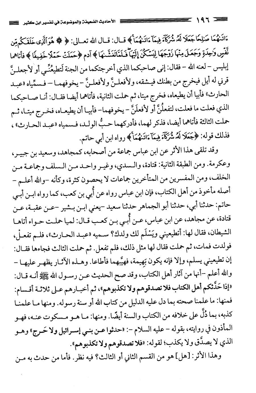 آتَاهُمَا صَالِحًا جَعَلا لَهُ شُرَكَاءَ فِيمَا آتَاهُمَا} قال: قال الله تعالى: {هُوَ الَّذِي خَلَقَكُمْ مِنْ نَفْسٍ وَاحِدَةٍ وَجَعَلَ مِنْهَا زَوْجَهَا لِيَسْكُنَ إِلَيْهَا فَلَمَّا تَغَشَّاهَا} آدم {حَمَلَتْ [حَمْلا خَفِيفًا]} فأتاهما إبليس - لعنه الله - فقال: إنى صاحبكما الذي أخرجتكما من الجنة لَتطيعُنِّي أو لأجعلنَّ قرني له أيل فيخرج من بطنك فيشقه، ولأفعلنَّ ولأفعلنَّ - يخوفهما - فسمِّياه "عبد الحارث" فأبيا أن يطيعاه، فخرج ميتا، ثم حملت الثانية، فأتاهما أيضا فقال: أنا صاحبكما الذي فعلت ما فعلت، لتفعلُنَّ أو لأفعلَنَّ - يخوفهما - فأبيا أن يطيعاه، فخرج ميتا، ثم حملت الثالثة فأتاهما أيضا، فذكر لهما، فأدركهما حبُّ الولد، فسمياه "عبد الحارث"، فذلك قوله: {جَعَلا لَهُ شُرَكَاءَ فِيمَا آتَاهُمَا} رواه ابن أبي حاتم.