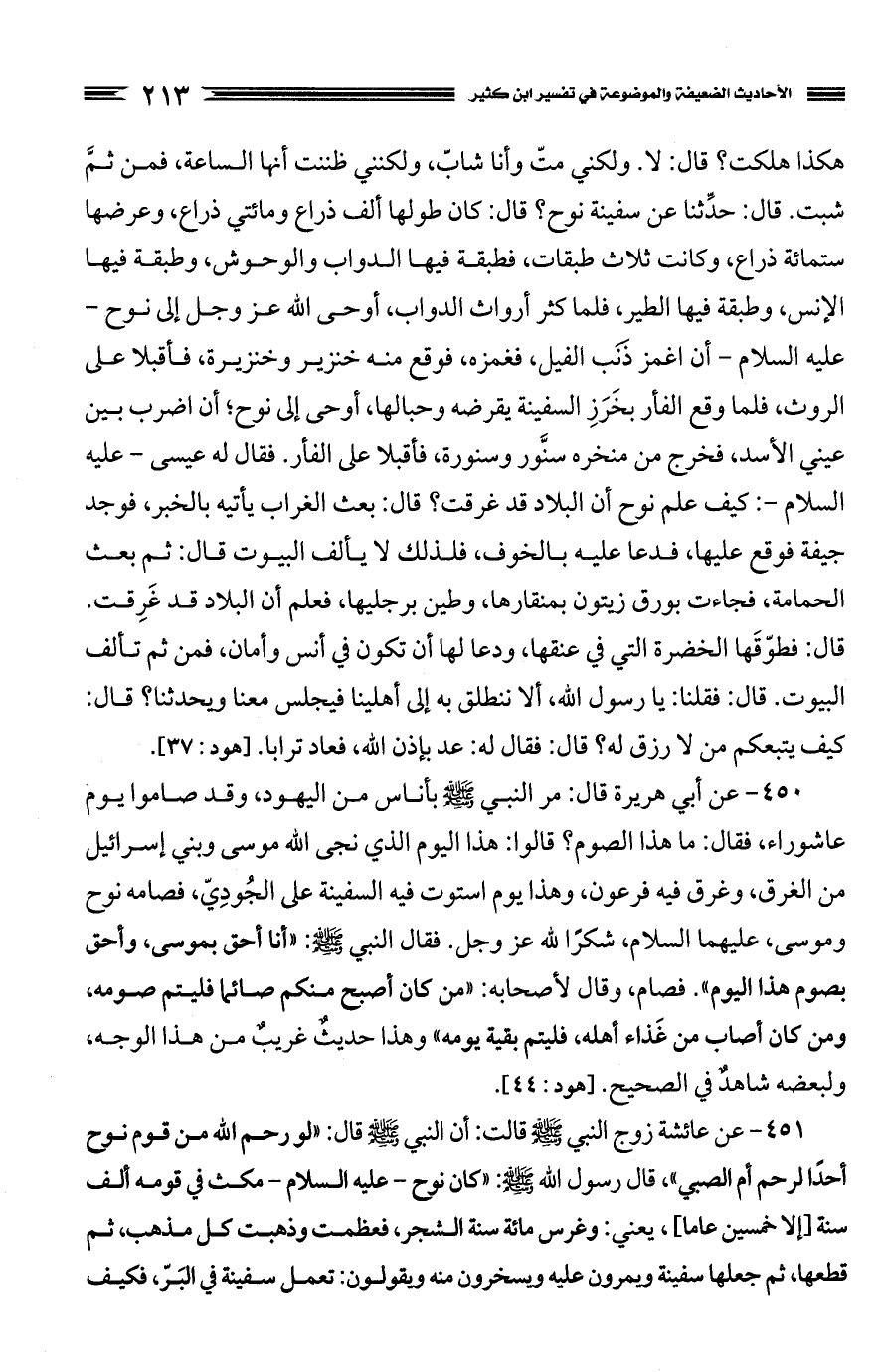 451 - عن عائشة زوج النبي صَلَّى اللَّهُ عَلَيْهِ وَسَلَّمَ قالت: أن النبي صَلَّى اللَّهُ عَلَيْهِ وَسَلَّمَ قال: "لو رحم الله من قوم نوح أحدًا لرحم أم الصبي"، قال رسول الله صَلَّى اللَّهُ عَلَيْهِ وَسَلَّمَ: "كان نوح، عليه السلام، مكث في قومه ألف سنة [إلا خمسين عاما]، يعني وغرس مائة سنة الشجر، فعظمت وذهبت كل مذهب، ثم قطعها، ثم جعلها سفينة ويمرون عليه ويسخرون منه ويقولون: تعمل سفينة في البَرّ، فكيف
