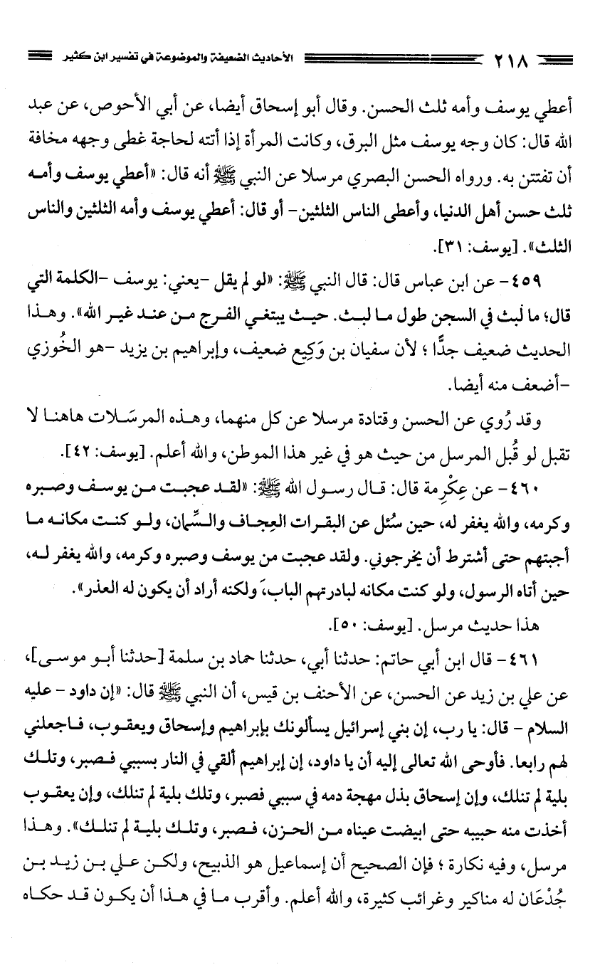460 - عن عِكْرِمة قال: قال رسول الله صَلَّى اللَّهُ عَلَيْهِ وَسَلَّمَ: "لقد عجبت من يوسف وصبره وكرمه، والله يغفر له، حين سُئل عن البقرات العِجاف والسِّمان، ولو كنت مكانه ما أجبتهم حتى أشترط أن يخرجوني. ولقد عجبت من يوسف وصبره وكرمه، والله يغفر له، حين أتاه الرسول، ولو كنت مكانه لبادرتهم الباب، ولكنه أراد أن يكون له العذر".
