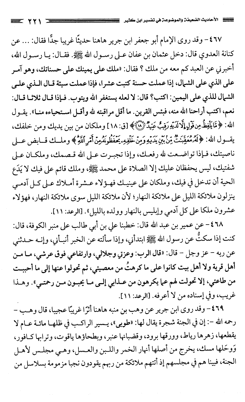 467 - وقد روى الإمام أبو جعفر ابن جرير هاهنا حديثًا غريبا جدا فقال: ... عن كنانة العدوي قال: دخل عثمان بن عفان على رسول الله صَلَّى اللَّهُ عَلَيْهِ وَسَلَّمَ. فقال: يا رسول الله، أخبرني عن العبدكم معه من ملك؟ فقال: "ملك على يمينك على حسناتك، وهو آمر على الذي على الشمال، إذا عملت حسنة كتبت عشرا، فإذا عملت سيئة قال الذي على الشمال للذي على اليمين: اكتب؟ قال: لا لعله يستغفر الله ويتوب. فإذا قال ثلاثا قال: نعم، اكتب أراحنا الله منه، فبئس القرين. ما أقل مراقبته لله وأقل استحياءه منا". يقول الله: {مَا يَلْفِظُ مِنْ قَوْلٍ إِلا لَدَيْهِ رَقِيبٌ عَتِيدٌ} [ق: 18] وملكان من بين يديك ومن خلفك، يقول الله: {لَهُ مُعَقِّبَاتٌ مِنْ بَيْنِ يَدَيْهِ وَمِنْ خَلْفِهِ يَحْفَظُونَهُ مِنْ أَمْرِ اللَّهِ} وملك قابض على ناصيتك، فإذا تواضعت لله رفعك، وإذا تجبرت على الله قصمك، وملكان على شفتيك، ليس يحفظان عليك إلا الصلاة على محمد صَلَّى اللَّهُ عَلَيْهِ وَسَلَّمَ، وملك قائم على فيك لا يَدَع الحية أن تدخل في فيك، وملكان على عينيك فهؤلاء عشرة أملاك على كل آدمي ينزلون ملائكة الليل على ملائكة النهار؛ لأن ملائكة الليل سوى ملائكة النهار، فهؤلاء عشرون ملكا على كل آدمي وإبليس بالنهار وولده بالليل". (الرعد: 11)