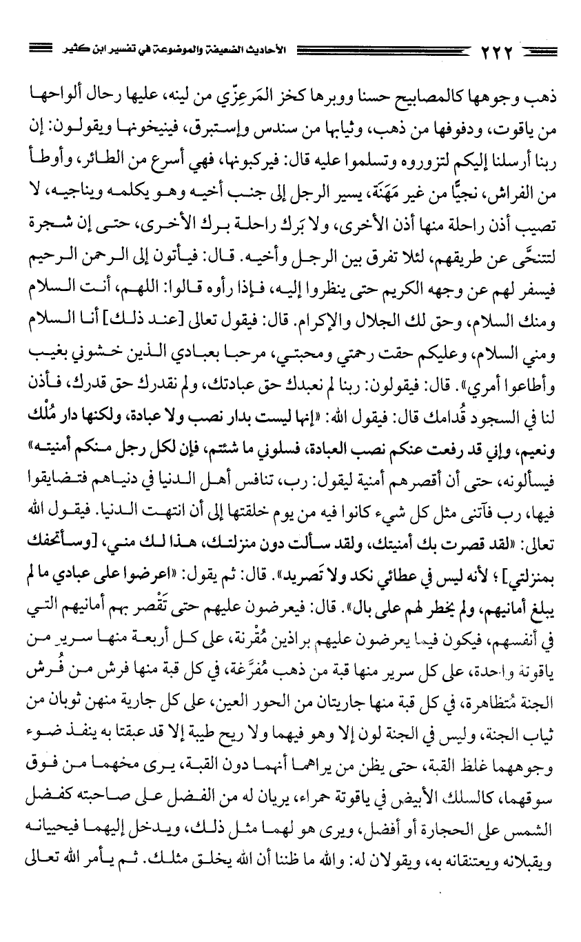 ذهب وجوهها كالمصابيح حسنا ووبرها كخز المْرعِزّي من لينه، عليها رحال ألواحها من ياقوت، ودفوفها من ذهب، وثيابها من سندس وإستبرق، فينيخونها ويقولون: إن ربنا أرسلنا إليكم لتزوروه وتسلموا عليه قال: فيركبونها، فهي أسرع من الطائر، وأوطأ من الفراش، نجيا من غير مَهَنَة، يسير الرجل إلى جنب أخيه وهو يكلمه ويناجيه، لا تصيب أذن راحلة منها أذن الأخرى، ولا بَرك راحلة برك الأخرى، حتى إن شجرة لتتنحَّى عن طريقهم، لئلا تفرق بين الرجل وأخيه. قال: فيأتون إلى الرحمن الرحيم فيسفر لهم عن وجهه الكريم حتى ينظروا إليه، فإذا رأوه قالوا: اللهم، أنت السلام ومنك السلام، وحق لك الجلال والإكرام. قال: فيقول تعالى [عند ذلك] أنا السلام ومني السلام، وعليكم حقت رحمتي ومحبتي، مرحبا بعبادي الذين خشوني بغيب وأطاعوا أمري".