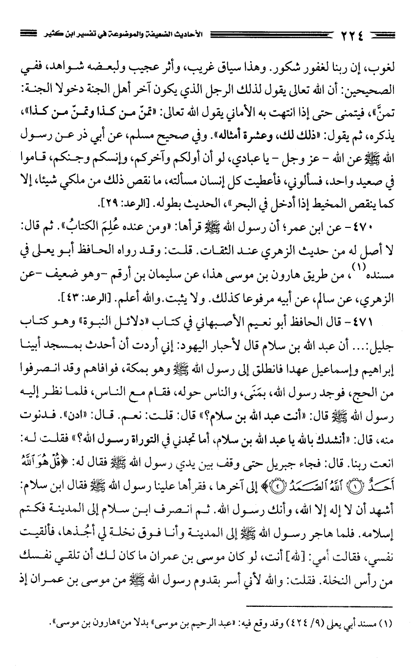 471 - قال الحافظ أبو نعيم الأصبهاني في كتاب "دلائل النبوة" وهو كتاب جليل: ... أن عبد الله بن سلام قال لأحبار اليهود: إني أردت أن أحدث بمسجد أبينا إبراهيم وإسماعيل عهدا فانطلق إلى رسول الله صَلَّى اللَّهُ عَلَيْهِ وَسَلَّمَ وهو بمكة، فوافاهم وقد انصرفوا من الحج، فوجد رسول الله، بمنى، والناس حوله، فقام مع الناس، فلما نظر إليه رسول الله صَلَّى اللَّهُ عَلَيْهِ وَسَلَّمَ قال: "أنت عبد الله بن سلام؟ " قال: قلت: نعم. قال: "ادن". فدنوت منه، قال: "أنشدك بالله يا عبد الله بن سلام، أما تجدني في التوراة رسول الله؟ " فقلت له: انعت ربنا. قال: فجاء جبريل حتى وقف بين يدي رسول الله صَلَّى اللَّهُ عَلَيْهِ وَسَلَّمَ فقال له: {قُلْ هُوَ اللَّهُ أَحَدٌ اللَّهُ الصَّمَدُ} إلى آخرها، فقرأها علينا رسول الله صَلَّى اللَّهُ عَلَيْهِ وَسَلَّمَ فقال ابن سلام: أشهد أن لا إله إلا الله، وأنك رسول الله. ثم انصرف ابن سلام إلى المدينة فكتم إسلامه. فلما هاجر رسول الله صَلَّى اللَّهُ عَلَيْهِ وَسَلَّمَ إلى المدينة وأنا فوق نخلة لي أجُذها، فألقيت نفسي، فقالت أمي: [لله] أنت، لو كان موسى بن عمران ما كان لك أن تلقي نفسك من رأس النخلة. فقلت: والله لأني أسر بقدوم رسول الله صَلَّى اللَّهُ عَلَيْهِ وَسَلَّمَ من موسى بن عمران إذ