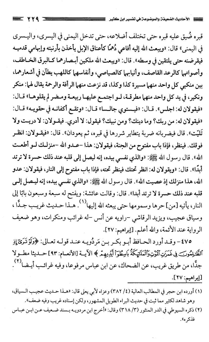 475 - وقد أورد الحافظ أبو بكر بن مَردُويه عند قوله تعالى: {وَلَوْ تَرَى إِذِ الظَّالِمُونَ فِي غَمَرَاتِ الْمَوْتِ وَالْمَلائِكَةُ بَاسِطُو أَيْدِيهِمْ} الآية [الأنعام: 93] حديثا مطولا جدا، من طريق غريب، عن الضحاك، عن ابن عباس مرفوعا، وفيه غرائب أيضا (¬2). (إبراهيم: 27)