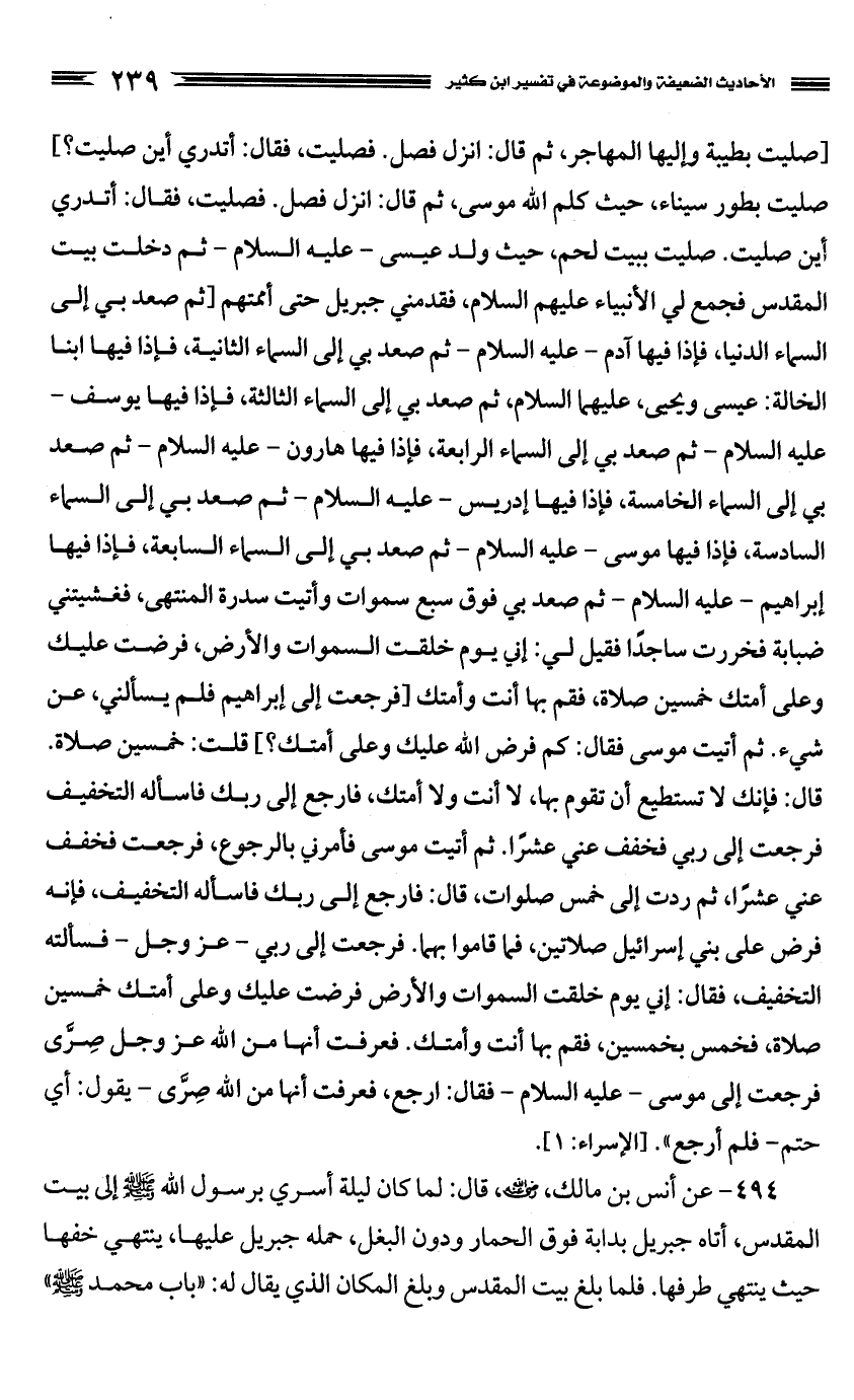 فرجعت إلى ربي، عز وجل، فسألته التخفيف، فقال: إني يوم خلقت السموات والأرض فرضت عليك وعلى أمتك خمسين صلاة، فخمس بخمسين، فقم بها أنت وأمتك. فعرفت أنها من الله عز وجل صِرَّى فرجعت إلى موسى، عليه السلام فقال: ارجع، فعرفت أنها من الله صِرَّى - يقول: أي حتم - فلم أرجع". (الإسراء: 1)