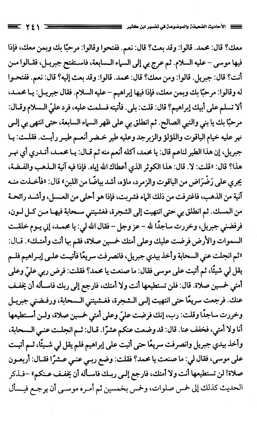 ثم انطلق بي على ظهر السماء السابعة، حتى انتهى بي إلى نهر عليه خيام الياقوت واللؤلؤ والزبرجد وعليه طير خضر أنعم طير رأيت. فقلت: يا جبريل، إن هذا الطير لناعم قال: يا محمد، آكله أنعم منه ثم قال: يا محمد، أتدري أي نهر هذا؟ قال: "قلت: لا. قال: هذا الكوثر الذي أعطاك الله إياه. فإذا فيه آنية الذهب والفضة، يجري على رَصْرَاض من الياقوت والزمرد، ماؤه، أشد بياضًا من اللبن" قال: "فأخذت منه آنية من الذهب، فاغترفت من ذلك الماء فشربت، فإذا هو أحلى من العسل، وأشد رائحة من المسك. ثم انطلق بي حتى انتهيت إلى الشجرة، فغشيتني سحابة فيها من كل لون، فرفضني جبريل، وخررت ساجدًا لله، عز وجل، فقال الله لي: يا محمد، إني يوم خلقت السموات والأرض فرضت عليك وعلى أمتك خمسين صلاة، فقم بها أنت وأمتك". قال: "ثم انجلت عني السحابة وأخذ بيدي جبريل، فانصرفت سريعًا فأتيت على إبراهيم فلم يقل لي شيئًا، ثم أتيت على موسى فقال: ما صنعت يا محمد؟ فقلت: فرض ربي عليّ وعلى أمتي خمسين صلاة. قال: فلن تستطيعها أنت ولا أمتك، فارجع إلى ربك فاسأله أن يخفف عنك. فرجعت سريعًا حتى انتهيت إلى الشجرة، فغشيتني السحابة، ورفضني جبريل وخررت ساجدًا وقلت: رب، إنك فرضت عليّ وعلى أمتي خمسين صلاة، ولن أستطيعها أنا ولا أمتي، فخفف عنا. قال: قد وضعت عنكم عشرًا. قال: ثم انجلت عني السحابة، وأخذ بيدي جبريل وانصرفت سريعًا حتى أتيت على إبراهيم فلم يقل لي شيئًا، ثم أتيت على موسى، فقال لي: ما صنعت يا محمد؟ فقلت: وضع ربي عني عشرًا فقال: أربعون صلاة! لن تستطيعها أنت ولا أمتك، فارجع إلى ربك فاسأله أن يخفف عنكم - فذكر الحديث كذلك إلى خمس صلوات، وخمس بخمسين ثم أمره موسى أن يرجع فيسأل