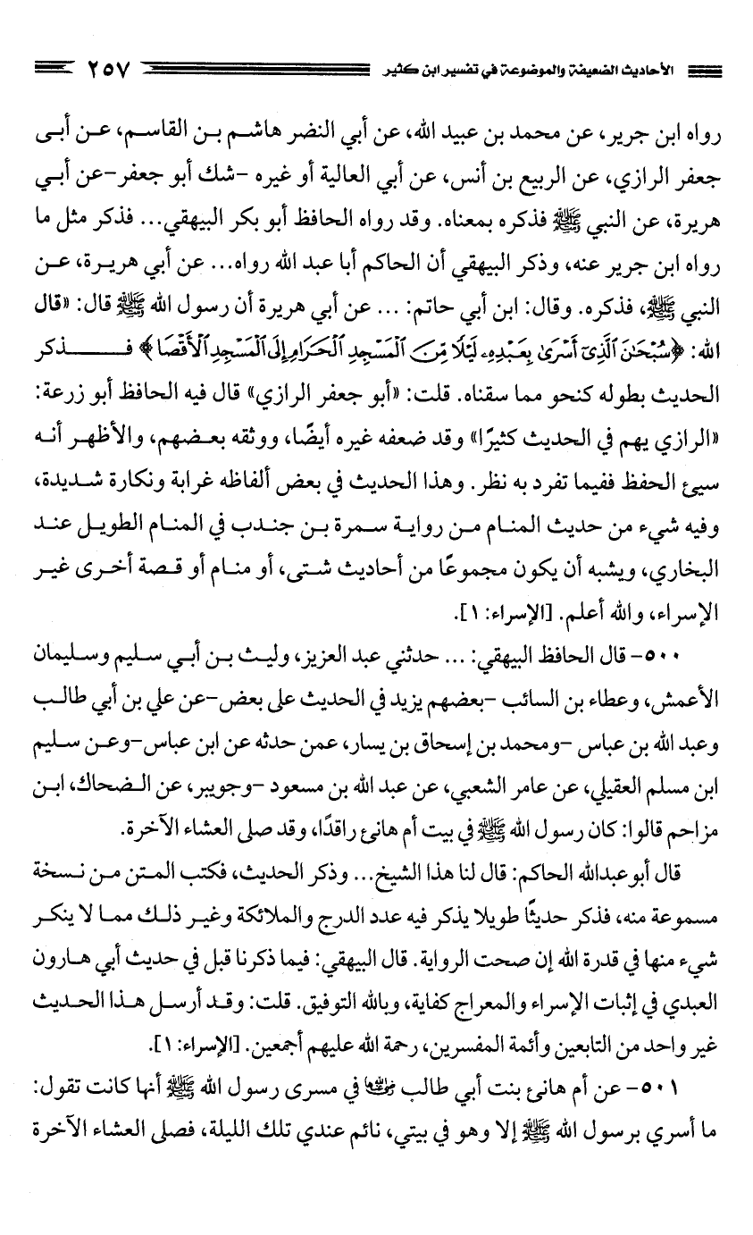 500 - قال الحافظ البيهقي: ... حدثني عبد العزيز، وليث بن أبي سليم وسليمان الأعمش، وعطاء بن السائب - بعضهم يزيد في الحديث على بعض - عن علي بن أبي طالب وعبد الله بن عباس - ومحمد بن إسحاق بن يسار، عمن حدثه عن ابن عباس - وعن سليم بن مسلم العقيلي، عن عامر الشعبي، عن عبد الله بن مسعود - وجويبر، عن الضحاك، ابن مزاحم قالوا: كان رسول الله صَلَّى اللَّهُ عَلَيْهِ وَسَلَّمَ في بيت أم هانئ راقدًا، وقد صلى العشاء الآخرة.