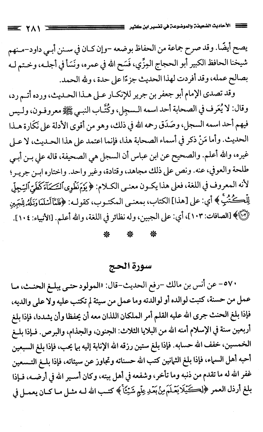 وقد تصدى الإمام أبو جعفر بن جرير للإنكار على هذا الحديث، ورده أتم رد، وقال: لا يُعَرف في الصحابة أحد اسمه السجِل، وكُتَّاب النبي صَلَّى اللَّهُ عَلَيْهِ وَسَلَّمَ معروفون، وليس فيهم أحد اسمه السجل، وصَدَق رحمه الله في ذلك، وهو من أقوى الأدلة على نَكَارة هذا الحديث. وأما مَنْ ذكر في أسماء الصحابة هذا، فإنما اعتمد على هذا الحديث، لا على غيره، والله أعلم. والصحيح عن ابن عباس أن السجل هي الصحيفة، قاله علي بن أبي طلحة والعوفي، عنه. ونص على ذلك مجاهد، وقتادة، وغير واحد. واختاره ابن جرير؛ لأنه المعروف في اللغة، فعلى هذا يكون معنى الكلام: {يَوْمَ نَطْوِي السَّمَاءَ كَطَيِّ السِّجِلِّ لِلْكُتُبِ} أي: على [هذا] الكتاب، بمعنى المكتوب، كقوله: {فَلَمَّا أَسْلَمَا وَتَلَّهُ لِلْجَبِينِ} [الصافات: 103]، أي: على الجبين، وله نظائر في اللغة، والله أعلم. (الأنبياء: 104)