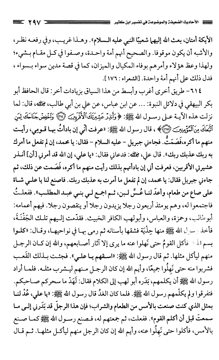 614 - طريق أخرى أغرب وأبسط من هذا السياق بزيادات أخر: قال الحافظ أبو بكر البيهقي في "دلائل النبوة": ... عن ابن عباس، عن علي بن أبي طالب، رضي الله عنه، قال: لما نزلت هذه الآية على رسول الله صَلَّى اللَّهُ عَلَيْهِ وَسَلَّمَ: {وَأَنْذِرْ عَشِيرَتَكَ الأقْرَبِينَ وَاخْفِضْ جَنَاحَكَ لِمَنِ اتَّبَعَكَ مِنَ الْمُؤْمِنِينَ}، قال رسول الله صَلَّى اللَّهُ عَلَيْهِ وَسَلَّمَ: "عرفت أنّي إن بادأتُ بها قومِي، رأيت منهم ما أكره، فَصَمَتُّ. فجاءني جبريل، عليه السلام، فقال: يا محمد، إن لم تفعل ما أمرك به ربك عذبك ربك". قال علي، رضي الله عنه: فدعاني فقال: "يا علي، إن الله قد أمرني [أن] أنذر عشيرتي الأقربين، فعرفت أني إن بادأتهم بذلك رأيت منهم ما أكره، فَصَمت عن ذلك، ثم جاءني جبريل فقال: يا محمد، إن لم تفعل ما أمرت به عذبك ربك. فاصنع لنا يا علي شاة على صاع من طعام، وأعدّ لنا عُسَّ لبن، ثم اجمع لي بني عبد المطلب". ففعلتُ فاجتمعوا له، وهم يومئذ أربعون رجلا يزيدون رجلا أو ينقصون رجلا. فيهم أعمامه: