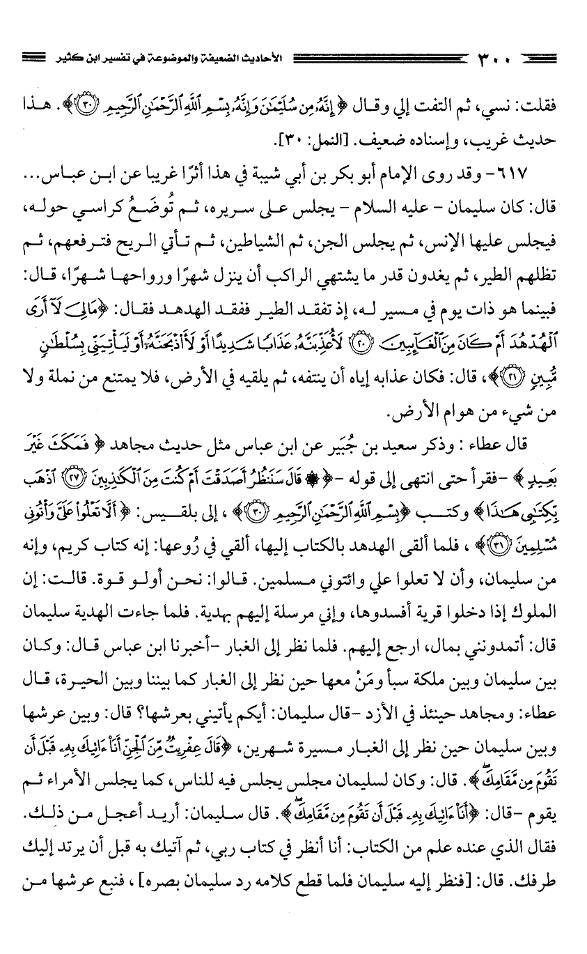 617 - وقد روى الإمام أبو بكر بن أبي شيبة في هذا أثرًا غريبا عن ابن عباس ... قال: كان سليمان، عليه السلام، يجلس على سريره، ثم تُوضَعُ كراسي حوله، فيجلس عليها الإنس، ثم يجلس الجن، ثم الشياطين، ثم تأتي الريح فترفعهم، ثم تظلهم الطير، ثم يغدون قدر ما يشتهي الراكب أن ينزل شهرًا ورواحها شهرًا، قال: فبينما هو ذات يوم في مسير له، إذ تفقد الطير ففقد الهدهد فقال: {مَا لِيَ لا أَرَى الْهُدْهُدَ أَمْ كَانَ مِنَ الْغَائِبِينَ * لأعَذِّبَنَّهُ عَذَابًا شَدِيدًا أَوْ لأذْبَحَنَّهُ أَوْ لَيَاتِيَنِّي بِسُلْطَانٍ مُبِينٍ}، قال: فكان عذابه إياه أن ينتفه، ثم يلقيه في الأرض، فلا يمتنع من نملة ولا من شيء من هوام الأرض.