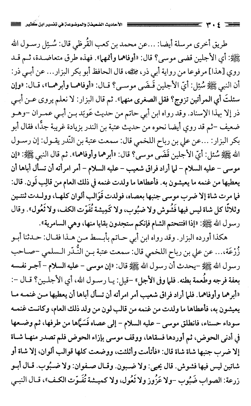 وقد رواه ابن أبي حاتم من حديث عَوبَد بن أبي عمران - وهو ضعيف - ثم قد روي أيضا نحوه من حديث عتبة بن الندر بزيادة غريبة جدا، فقال أبو بكر البزار: ... عن علي بن رباح اللخمي قال: سمعت عتبة بن النّدر يقول: إن رسول الله صَلَّى اللَّهُ عَلَيْهِ وَسَلَّمَ سُئل: أيّ الأجلين قَضَى موسى؟ قال: "أبرهما وأوفاهما". ثم قال النبي صَلَّى اللَّهُ عَلَيْهِ وَسَلَّمَ: "إن موسى، عليه السلام، لما أراد فراق شعيب عليه السلام، أمر امرأته أن تسأل أباها أن يعطيها من غنمه ما يعيشون به. فأعطاها ما ولدت غنمه في ذلك العام من قالِب لَون. قال: فما مرت شاة إلا ضرب موسى جنبها بعصاه، فولدت قَوَالب ألوان كلها، وولدت ثنتين وثلاثًا كل شاة ليس فيها فَشُوش ولا ضبُوب، ولا كَمِيشة تُفَوّت الكف، ولا ثَعُول". وقال رسول الله صَلَّى اللَّهُ عَلَيْهِ وَسَلَّمَ: "إذا افتتحتم الشام فإنكم ستجدون بقايا منها، وهي السامرية".