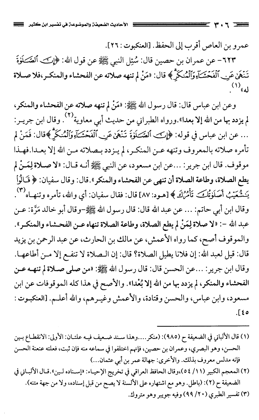 623 - عن عمران بن حصين قال: سُئِل النبي صَلَّى اللَّهُ عَلَيْهِ وَسَلَّمَ عن قول الله: {إِنَّ الصَّلاةَ تَنْهَى عَنِ الْفَحْشَاءِ وَالْمُنْكَرِ} قال: "مَنْ لم تنهه صلاته عن الفحشاء والمنكر، فلا صلاة له". (¬1)