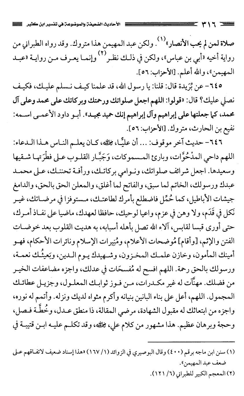 645 - عن بُرَيدة قال: قلنا: يا رسول الله، قد علمنا كيف نسلم عليك، فكيف نصلي عليك؟ قال: "قولوا: اللهم اجعل صلواتك ورحمتك وبركاتك على محمد وعلى آل محمد، كما جعلتها على إبراهيم وآل إبراهيم إنك حميد مجيد".