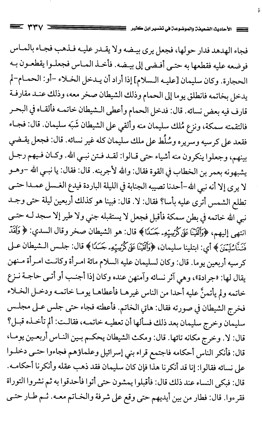 وقال السدي: {وَلَقَدْ فَتَنَّا سُلَيْمَانَ} أي: ابتلينا سليمان، {وَأَلْقَيْنَا عَلَى كُرْسِيِّهِ جَسَدًا} قال: جلس الشيطان على كرسيه أربعين يوما. قال: وكان لسليمان عليه السلام مائة امرأة وكانت امرأة منهن يقال لها: "جرادة"، وهي آثر نسائه وآمنهن عنده وكان إذا أجنب أو أتى حاجة نزع خاتمه ولم يأتمن عليه أحدا من الناس غيرها فأعطاها يوما خاتمه ودخل الخلاء فخرج الشيطان في صورته فقال: هاتي الخاتم. فأعطته فجاء حتى جلس على مجلس سليمان وخرج سليمان بعد ذلك فسألها أن تعطيه خاتمه، فقالت: ألم تأخذه قبل؟ قال: لا. وخرج مكانه تائها. قال: ومكث الشيطان يحكم بين الناس أربعين يوما، قال: فأنكر الناس أحكامه فاجتمع قراء بني إسرائيل وعلماؤهم فجاءوا حتى دخلوا على نسائه فقالوا: إنا قد أنكرنا هذا فإن كان سليمان فقد ذهب عقله وأنكرنا أحكامه. قال: فبكى النساء عند ذلك قال: فأقبلوا يمشون حتى أتوا فأحدقوا به ثم نشروا التوراة فقرءوا. قال: فطار من بين أيديهم حتى وقع على شرفة والخاتم معه. ثم طار حتى