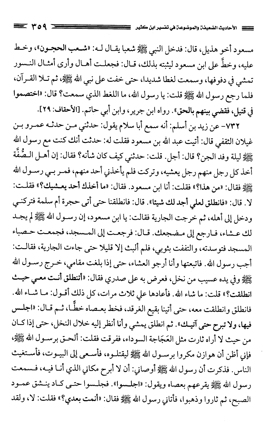 732 - عن زيد بن أسلم: أنه سمع أبا سلام يقول: حدثني من حدثه عمرو بن غيلان الثقفي قال: أتيت عبد الله بن مسعود فقلت له: حدثت أنك كنت مع رسول الله صَلَّى اللَّهُ عَلَيْهِ وَسَلَّمَ ليلة وفد الجن؟ قال: أجل. قلت: حدثني كيف كان شأنه؟ فقال: إن أهل الصفة أخذ كل رجل منهم رجل يعشيه، وتركت فلم يأخذني أحد منهم، فمر بي رسول الله صَلَّى اللَّهُ عَلَيْهِ وَسَلَّمَ فقال: "من هذا؟ " فقلت: أنا ابن مسعود. فقال: "ما أخذك أحد يعشيك؟ " فقلت: لا. قال: "فانطلق لعلي أجد لك شيئا". قال: فانطلقنا حتى أتى حجرة أم سلمة فتركني ودخل إلى أهله، ثم خرجت الجارية فقالت: يا ابن مسعود، إن رسول الله صَلَّى اللَّهُ عَلَيْهِ وَسَلَّمَ لم يجد لك عشاء، فارجع إلى مضجعك. قال: فرجعت إلى المسجد، فجمعت حصباء المسجد فتوسدته، والتففت بثوبي، فلم ألبث إلا قليلا حتى جاءت الجارية، فقالت: أجب رسول الله. فاتبعتها وأنا أرجو العشاء، حتى إذا بلغت مقامي، خرج رسول الله صَلَّى اللَّهُ عَلَيْهِ وَسَلَّمَ وفي يده عسيب من نخل، فعرض به على صدري فقال: "أتنطلق أنت معي حيث انطلقت؟ " قلت: ما شاء الله. فأعادها علي ثلاث مرات، كل ذلك أقول: ما شاء الله. فانطلق وانطلقت معه، حتى أتينا بقيع الغرقد، فخط بعصاه خطا، ثم قال: "اجلس فيها، ولا تبرج حتى آتيك". ثم انطلق يمشي وأنا أنظر إليه خلال النخل، حتى إذا كان من حيث لا أراه ثارت مثل العَجَاجة السوداء، ففرقت فقلت: ألحق برسول الله صَلَّى اللَّهُ عَلَيْهِ وَسَلَّمَ، فإني أظن أن هوازن مكروا برسول الله صَلَّى اللَّهُ عَلَيْهِ وَسَلَّمَ ليقتلوه، فأسعى إلى البيوت، فأستغيث الناس. فذكرت أن رسول الله صَلَّى اللَّهُ عَلَيْهِ وَسَلَّمَ أوصاني: أن لا أبرح مكاني الذي أنا فيه، فسمعت رسول الله صَلَّى اللَّهُ عَلَيْهِ وَسَلَّمَ يقرعهم بعصاه ويقول: "اجلسوا".