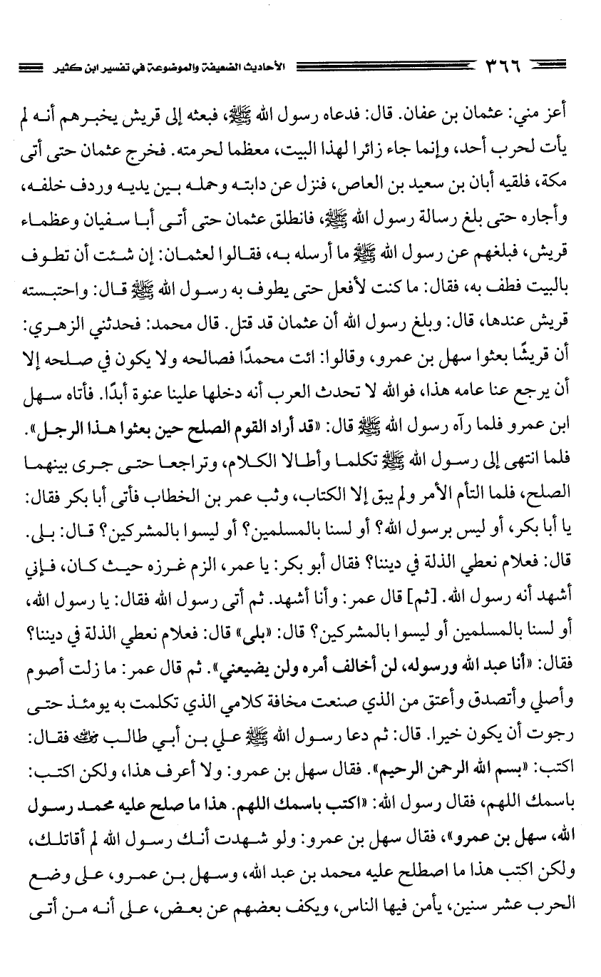 قال محمد: فحدثني الزهري: أن قريشًا بعثوا سهل بن عمرو، وقالوا: ائت محمدًا فصالحه ولا يكون في صلحه إلا أن يرجع عنا عامه هذا، فوالله لا تحدث العرب أنه دخلها علينا عنوة أبدًا. فأتاه سهل بن عمرو فلما رآه رسول الله صَلَّى اللَّهُ عَلَيْهِ وَسَلَّمَ قال: "قد أراد القوم الصلح حين بعثوا هذا الرجل". فلما انتهى إلى رسول الله صَلَّى اللَّهُ عَلَيْهِ وَسَلَّمَ تكلما وأطالا الكلام، وتراجعا حتى جرى بينهما الصلح، فلما التأم الأمر ولم يبق إلا الكتاب، وثب عمر بن الخطاب فأت أبا بكر فقال: يا أبا بكر، أو ليس برسول الله؟ أو لسنا بالمسلمين؟ أو ليسوا بالمشركين؟ قال: بلى. قال: فعلام نعطي الذلة في ديننا؟ فقال أبو بكر: يا عمر، الزم غرزه حيث كان، فإني أشهد أنه رسول الله. [ثم] قال عمر: وأنا أشهد. ثم أتى رسول الله فقال: يا رسول الله، أو لسنا بالمسلمين أو ليسوا بالمشركين؟ قال: "بلى" قال: فعلام نعطي الذلة في ديننا؟ فقال: "أنا عبد الله ورسوله، لن أخالف أمره ولن يضيعني". ثم قال عمر: ما زلت أصوم وأصلي وأتصدق وأعتق من الذي صنعت مخافة كلامي الذي تكلمت به يومئذ حتى رجوت أن يكون خيرا. قال: ثم دعا رسول الله صَلَّى اللَّهُ عَلَيْهِ وَسَلَّمَ علي بن أبي طالب [رضي الله عنه] فقال: اكتب: "بِسْمِ اللَّهِ الرَّحْمَنِ الرَّحِيمِ". فقال سهل بن عمرو: ولا أعرف هذا، ولكن اكتب: "باسمك اللهم، فقال رسول الله: "اكتب باسمك اللهم.