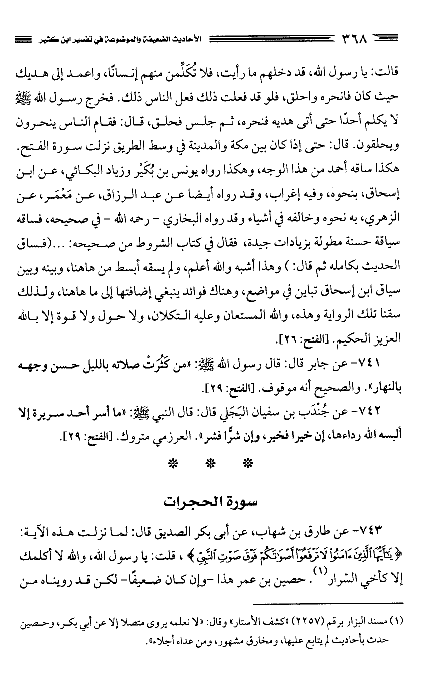 743 - عن طارق بن شهاب، عن أبى بكر الصديق قال: لما نزلت هذه الآية: {يَا أَيُّهَا الَّذِينَ آمَنُوا لا تَرْفَعُوا أَصْوَاتَكُمْ فَوْقَ صَوْتِ النَّبِيِّ}، قلت: يا رسول الله، والله لا أكلمك إلا كأخي السّرار. (¬1) حصين بن عمر هذا - وإن كان ضعيفًا - لكن قد رويناه من