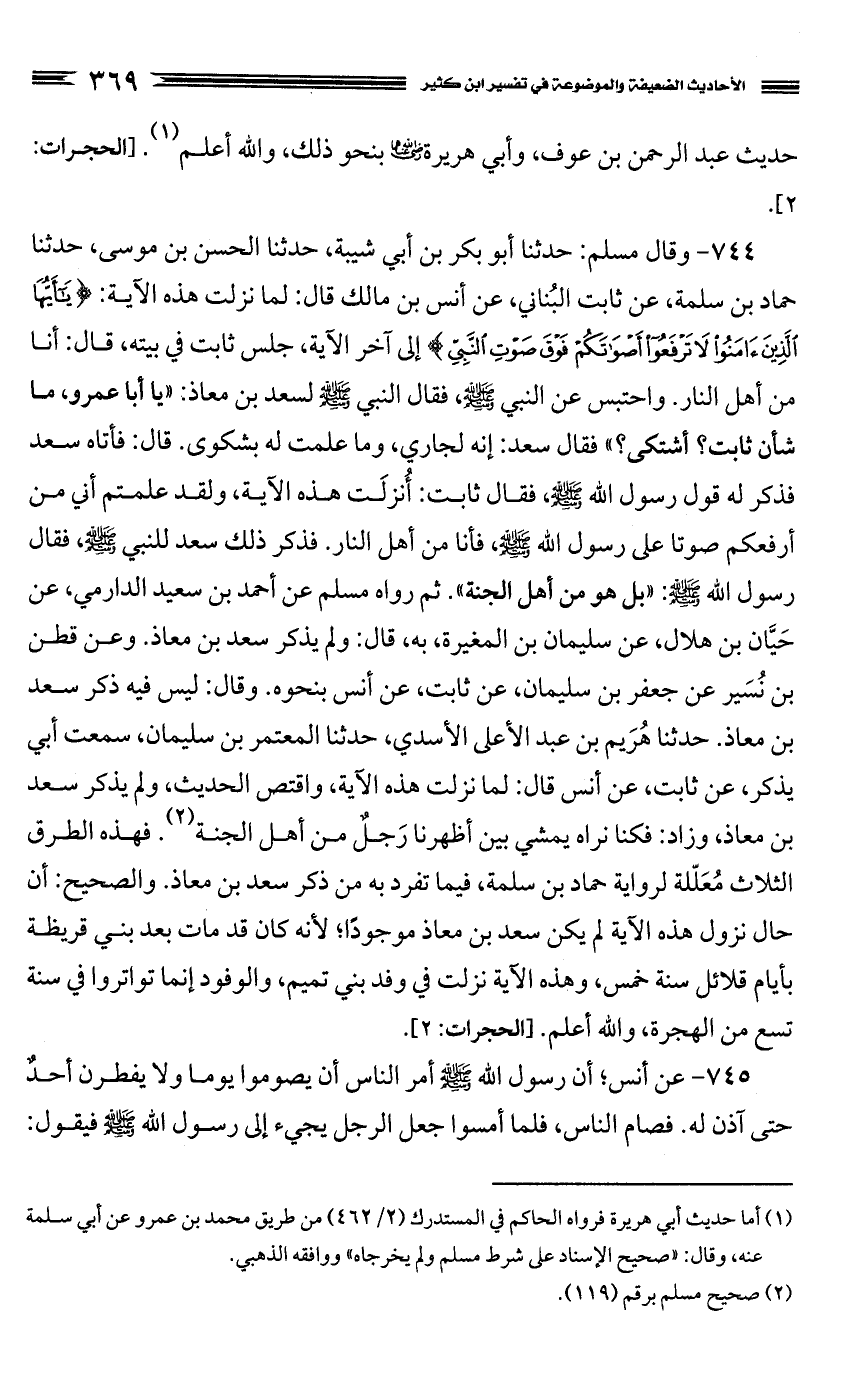 744 - وقال مسلم: حدثنا أبو بكر بن أبي شيبة، حدثنا الحسن بن موسى، حدثنا حماد بن سلمة، عن ثابت البُناني، عن أنس بن مالك قال: لما نزلت هذه الآية: {يَا أَيُّهَا الَّذِينَ آمَنُوا لا تَرْفَعُوا أَصْوَاتَكُمْ فَوْقَ صَوْتِ النَّبِيِّ} إلى آخر الآية، جلس ثابت في بيته، قال: أنا من أهل النار. واحتبس عن النبي صَلَّى اللَّهُ عَلَيْهِ وَسَلَّمَ، فقال النبي صَلَّى اللَّهُ عَلَيْهِ وَسَلَّمَ لسعد بن معاذ: "يا أبا عمرو، ما شأن ثابت؟ أشتكى؟ " فقال سعد: إنه لجاري، وما علمت له بشكوى. قال: فأتاه سعد فذكر له قول رسول الله صَلَّى اللَّهُ عَلَيْهِ وَسَلَّمَ، فقال ثابت: أُنزلَت هذه الآية، ولقد علمتم أني من أرفعكم صوتا على رسول الله صَلَّى اللَّهُ عَلَيْهِ وَسَلَّمَ، فأنا من أهل النار. فذكر ذلك سعد للنبي صَلَّى اللَّهُ عَلَيْهِ وَسَلَّمَ، فقال رسول الله صَلَّى اللَّهُ عَلَيْهِ وَسَلَّمَ: "بل، هو من أهل الجنة". ثم رواه مسلم عن أحمد بن سعيد الدارمي، عن حَيَّان بن هلال، عن سليمان بن المغيرة، به، قال: ولم يذكر سعد بن معاذ. وعن قطن بن نُسَير عن جعفر بن سليمان، عن ثابت، عن أنس بنحوه. وقال: ليس فيه ذكر سعد بن معاذ.