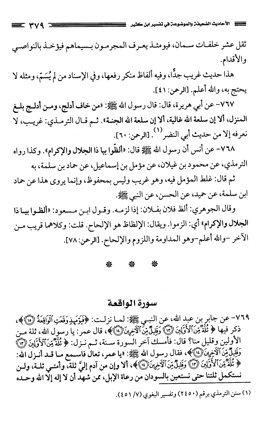 769 - عن جابر بن عبد الله، عن النبي صَلَّى اللَّهُ عَلَيْهِ وَسَلَّمَ: لما نزلت: {فَيَوْمَئِذٍ وَقَعَتِ الْوَاقِعَةُ}، ذكر فيها {ثُلَّةٌ مِنَ الأوَّلِينَ * وَقَلِيلٌ مِنَ الآخِرِينَ}، قال عمر: يا رسول الله، ثلة من الأولين وقليل منا؟ قال: فأمسك آخر السورة سنة، ثم نزل: {ثُلَّةٌ مِنَ الأوَّلِينَ * وَثُلَّةٌ مِنَ الآخِرِينَ}، فقال رسول الله صَلَّى اللَّهُ عَلَيْهِ وَسَلَّمَ: "يا عمر، تعال فاسمع ما قد أنزل الله: {ثُلَّةٌ مِنَ الأوَّلِينَ * وَثُلَّةٌ مِنَ الآخِرِينَ}، ألا وإن من آدم إليَّ ثلة، وأمتي ثلة، ولن نستكمل ثلتنا حتى نستعين بالسودان من رعاة الإبل، ممن شهد أن لا إله إلا الله وحده