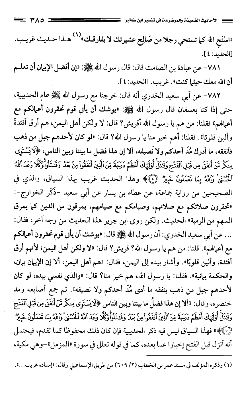 782 - عن أبي سعيد الخدري أنه قال: خرجنا مع رسول الله صَلَّى اللَّهُ عَلَيْهِ وَسَلَّمَ عام الحديبية، حتى إذا كنا بعسفان قال رسول الله صَلَّى اللَّهُ عَلَيْهِ وَسَلَّمَ: "يوشك أن يأتي قوم تحقرون أعمالكم مع أعمالهم" فقلنا: من هم يا رسول الله أقريش؟ قال: لا ولكن أهل اليمن، هم أرق أفئدةً وألين قلوبًا". فقلنا: أهم خير منا يا رسول الله؟ قال: "لو كان لأحدهم جبل من ذهب فأنفقه، ما أدرك مُدّ أحدكم ولا نَصيفه، ألا إن هذا فضل ما بيننا وبين الناس، {لا يَسْتَوِي مِنْكُمْ مَنْ أَنْفَقَ مِنْ قَبْلِ الْفَتْحِ وَقَاتَلَ أُولَئِكَ أَعْظَمُ دَرَجَةً مِنَ الَّذِينَ أَنْفَقُوا مِنْ بَعْدُ وَقَاتَلُوا وَكُلا وَعَدَ اللَّهُ الْحُسْنَى وَاللَّهُ بِمَا تَعْمَلُونَ خَبِيرٌ}
