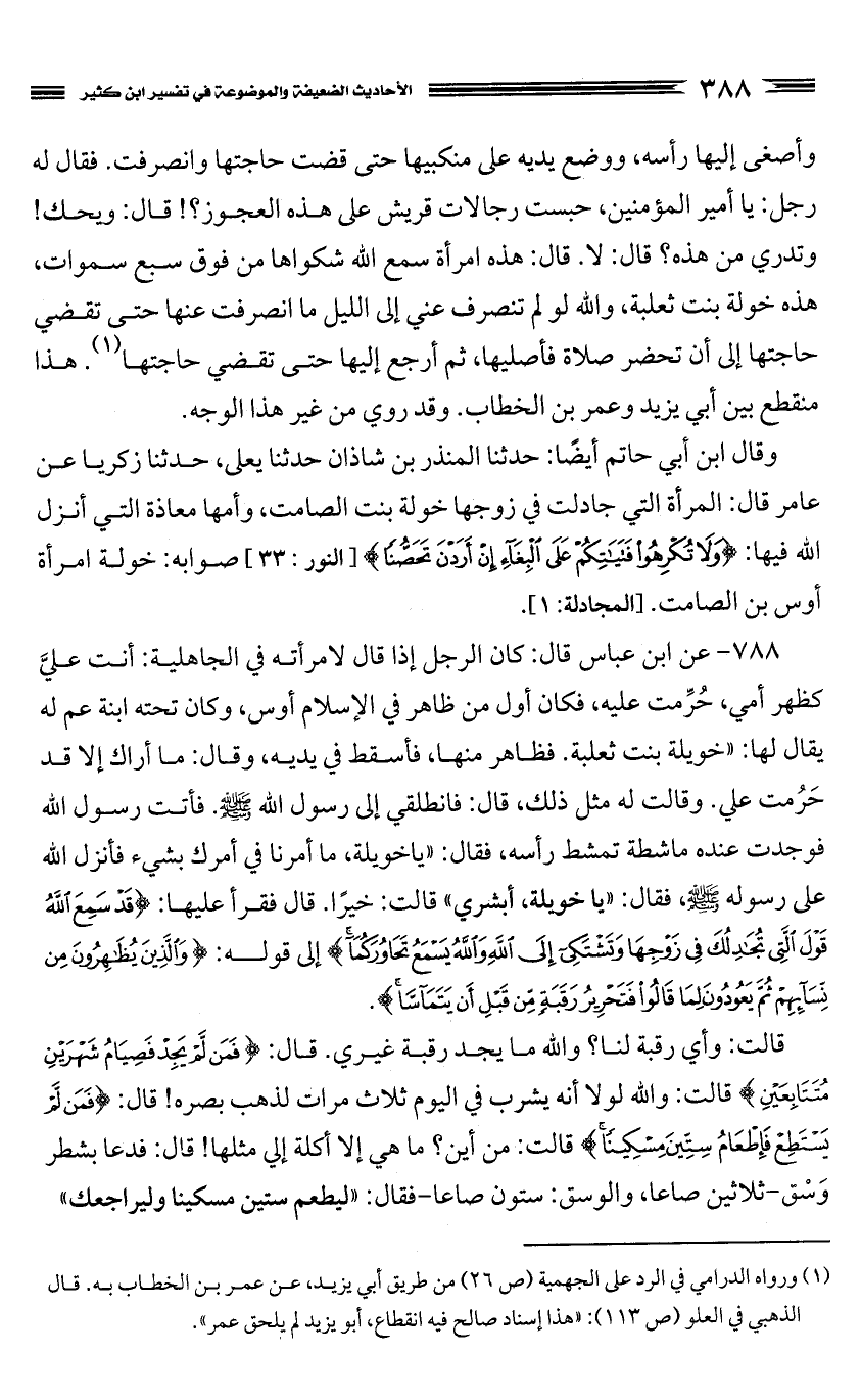 788 - عن ابن عباس قال: كان الرجل إذا قال لامرأته في الجاهلية: أنت عليَّ كظهر أمي، حُرِّمت عليه، فكان أول من ظاهر في الإسلام أوس، وكان تحته ابنة عم له يقال لها: "خويلة بنت ثعلبة. فظاهر منها، فأسقط في يديه، وقال: ما أراك إلا قد حَرُمت علي. وقالت له مثل ذلك، قال: فانطلقي إلى رسول الله صَلَّى اللَّهُ عَلَيْهِ وَسَلَّمَ. فأتت رسول الله فوجدت عنده ماشطة تمشط رأسه، فقال: "ياخويلة، ما أمرنا في أمرك بشيء فأنزل الله على رسوله صَلَّى اللَّهُ عَلَيْهِ وَسَلَّمَ، فقال: " يا خويلة، أبشري" قالت: خيرًا. قال فقرأ عليها: {قَدْ سَمِعَ اللَّهُ قَوْلَ الَّتِي تُجَادِلُكَ فِي زَوْجِهَا وَتَشْتَكِي إِلَى اللَّهِ وَاللَّهُ يَسْمَعُ تَحَاوُرَكُمَا} إلى قوله: {وَالَّذِينَ يُظَاهِرُونَ مِنْ نِسَائِهِمْ ثُمَّ يَعُودُونَ لِمَا قَالُوا فَتَحْرِيرُ رَقَبَةٍ مِنْ قَبْلِ أَنْ يَتَمَاسَّا}