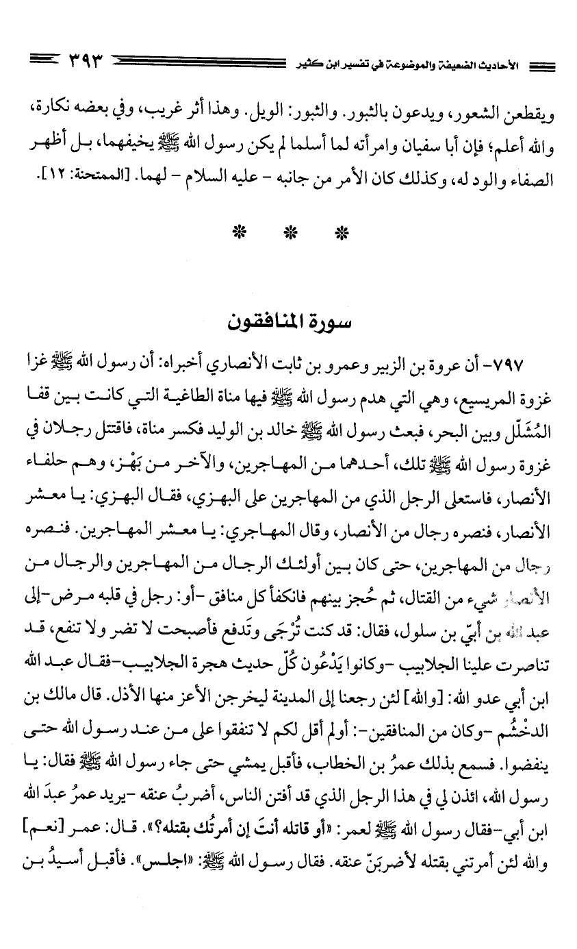 797 - أن عروة بن الزبير وعمرو بن ثابت الأنصاري أخبراه: أن رسول الله صَلَّى اللَّهُ عَلَيْهِ وَسَلَّمَ غزا غزوة المريسيع، وهي التي هدم رسول الله صَلَّى اللَّهُ عَلَيْهِ وَسَلَّمَ فيها مناة الطاغية التي كانت بين قفا المُشَلّل وبين البحر، فبعث رسول الله صَلَّى اللَّهُ عَلَيْهِ وَسَلَّمَ خالد بن الوليد فكسر مناة، فاقتتل رجلان في غزوة رسول الله صَلَّى اللَّهُ عَلَيْهِ وَسَلَّمَ تلك، أحدهما من المهاجرين، والآخر من بَهْز، وهم حلفاء الأنصار، فاستعلى الرجل الذي من المهاجرين على البهزي، فقال البهزي: يا معشر الأنصار، فنصره رجال من الأنصار، وقال المهاجري: يا معشر المهاجرين. فنصره رجال من المهاجرين، حتى كان بين أولئك الرجال من المهاجرين والرجال من الأنصار شيء من القتال، ثم حُجز بينهم فانكفأ كل منافق - أو: رجل في قلبه مرض - إلى عبد الله بن أبيّ بن سلول، فقال: قد كنت تُرْجَى وتَدفع فأصبحت لا تضر ولا تنفع، قد تناصرت علينا الجلابيب - وكانوا يَدْعُون كُلّ حديث هجرة الجلابيب - فقال عبد الله بن أبي عدو الله: [والله] لئن رجعنا إلى المدينة ليخرجن الأعز منها الأذل. قال مالك بن الدخْشُم - وكان من المنافقين -: أولم أقل لكم لا تنفقوا على من عند رسول الله حتى ينفضوا. فسمع بذلك عمرُ بن الخطاب، فأقبل يمشي حتى جاء رسول الله صَلَّى اللَّهُ عَلَيْهِ وَسَلَّمَ فقال: يا رسول الله، ائذن لي في هذا الرجل الذي قد أفتن الناس، أضربُ عنقه - يريد عمرُ عبدَ الله بن أبي - فقال رسول الله صَلَّى اللَّهُ عَلَيْهِ وَسَلَّمَ لعمر: "أو قاتله أنتَ إن أمرتُك بقتله؟ ". قال: عمر [نعم] والله لئن أمرتني بقتله لأضربَنّ عنقه. فقال رسول الله صَلَّى اللَّهُ عَلَيْهِ وَسَلَّمَ: "اجلس". فأقبل أسيدُ بن